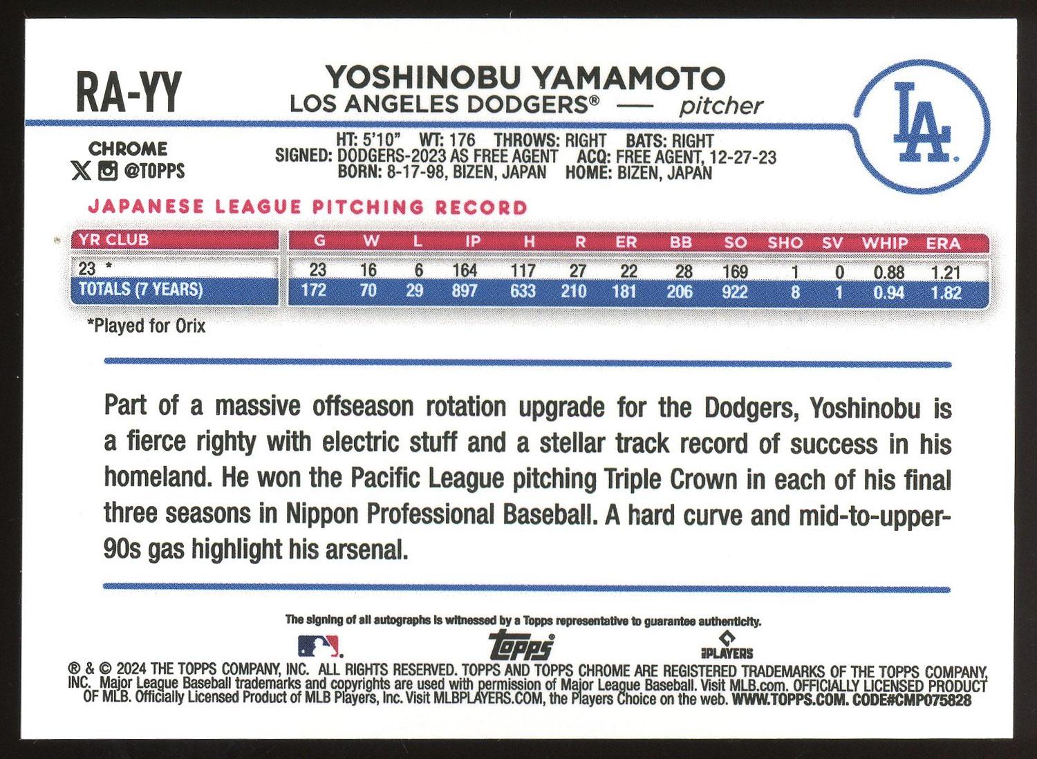 Yoshinobu Yamamoto 2024 Topps Chrome Purple Rookie Auto Card /250