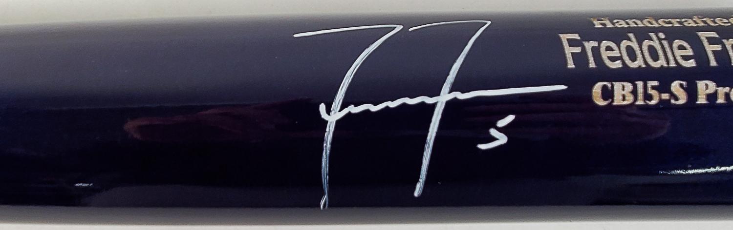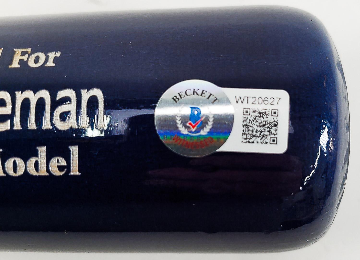 This autographed baseball bat has been personally hand-signed by Freddie Freeman of the Los Angeles Dodgers. This autograph is certified by Beckett Authentication Services (BAS) Witness Certification. That means that a Beckett representative was present when this item was signed. It comes with the numbered authentication hologram with a QR code that verifies the authentication on the Beckett website.