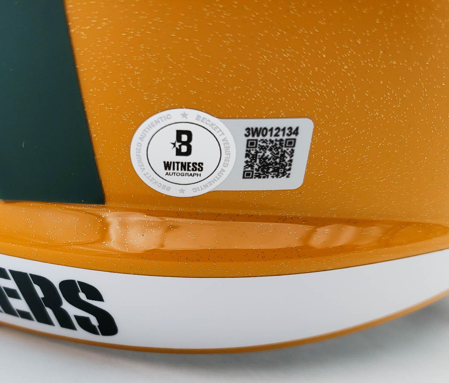 This autographed full size helmet has been personally hand-signed by Jordan Love of the Green Bay Packers. This autograph is certified by Beckett Authentication Services (BAS) Witness Certification. That means that a Beckett representative was present when this item was signed. It comes with the numbered authentication hologram with a QR code that verifies the authentication on the Beckett website.