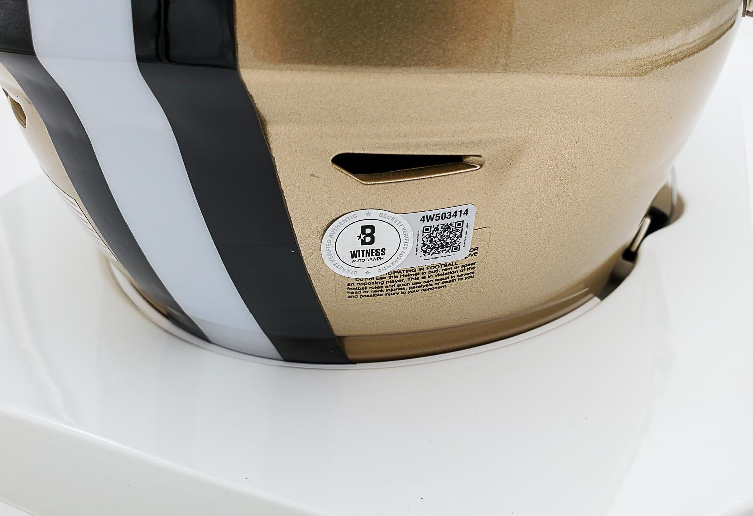 This autographed Riddell mid size MIDI helmet has been personally hand-signed by Drew Brees "SB XLIV MVP" of the New Orleans Saints. This autograph is certified by Beckett Authentication Services (BAS) Witness Certification. That means that a Beckett representative was present when this item was signed. It comes with the numbered authentication hologram with a QR code that verifies the authentication on the Beckett website.