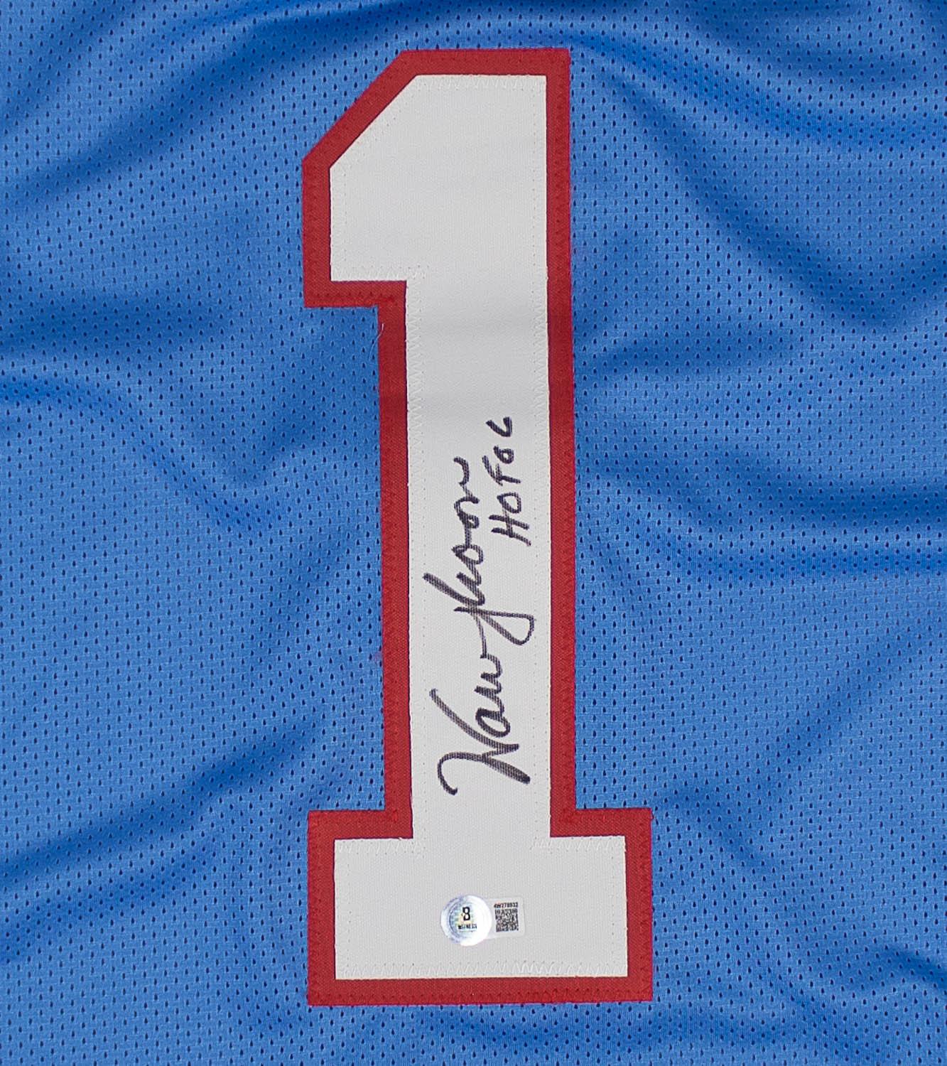 This autographed jersey has been personally hand-signed by Warren Moon ("HOF 06" inscription) of the Houston Oilers. This autograph is certified by Beckett Authentication Services (BAS) Witness Certification. That means that a Beckett representative was present when this item was signed. It comes with the numbered authentication hologram with a QR code that verifies the authentication on the Beckett website.