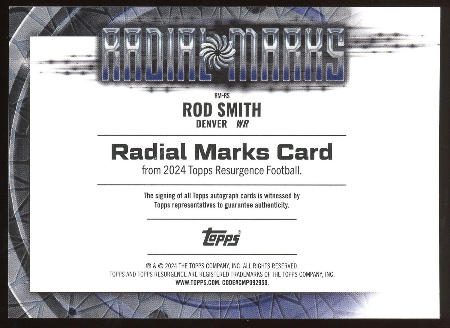 Rod Smith 2024 Topps Resurgence Blue Auto Card /99. Please see pictures for details on the condition of this card.