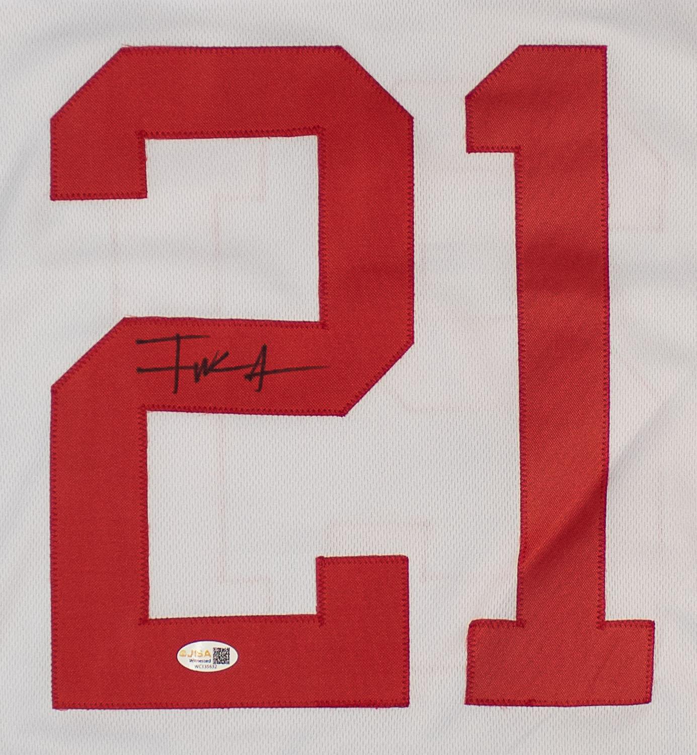 This autographed jersey has been personally hand-signed by Frank Gore of the San Francisco 49ers. This autograph is certified by James Spence Authentication's (JSA) Witnessed Protection Program. That means that a JSA representative was present when this item was signed. It comes with the numbered authentication hologram with a QR code that verifies the authentication on the JSA website.