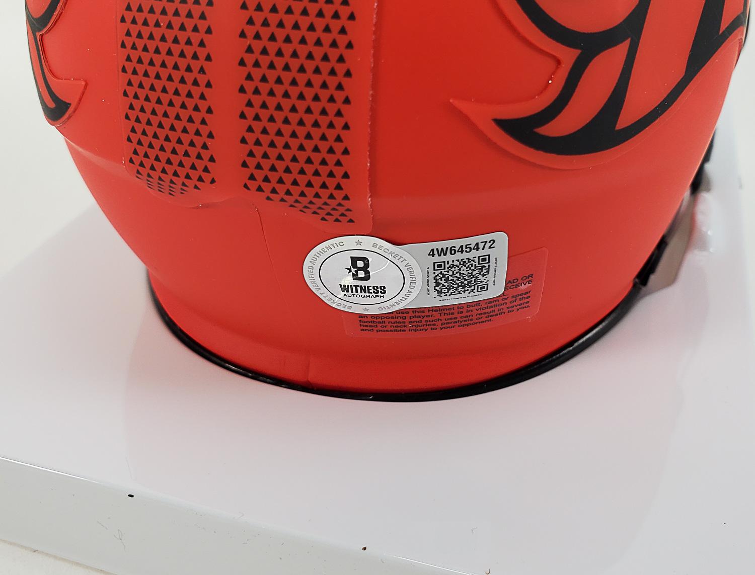 This autographed Riddell Speed mini helmet has been personally hand-signed by Ed McCaffrey of the Denver Broncos. This autograph is certified by Beckett Authentication Services (BAS) Witness Certification. That means that a Beckett representative was present when this item was signed. It comes with the numbered authentication hologram with a QR code that verifies the authentication on the Beckett website.