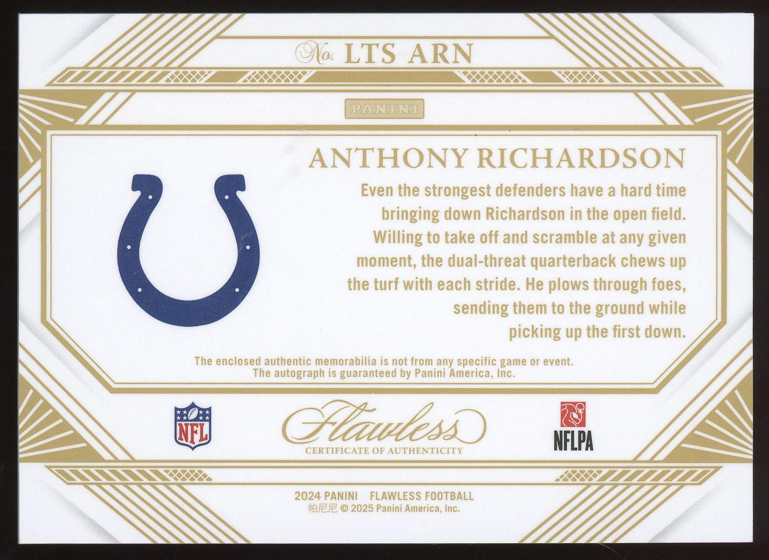 Anthony Richardson 2024 Panini Flawless Symbolic Nike Logo Auto Card /2. Please see pictures for details on the condition of this card.