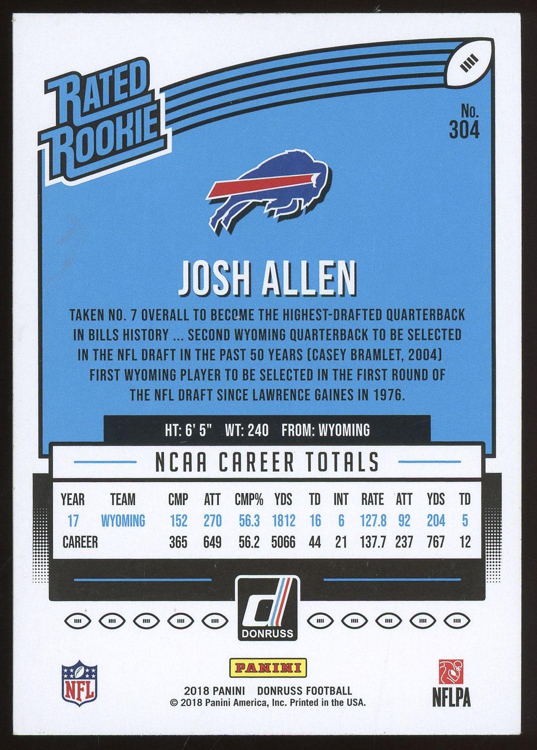Josh Allen 2018 Panini Donruss Press Proof Blue Rated Rookie Card #304. Please see pictures for details on the condition of this card.