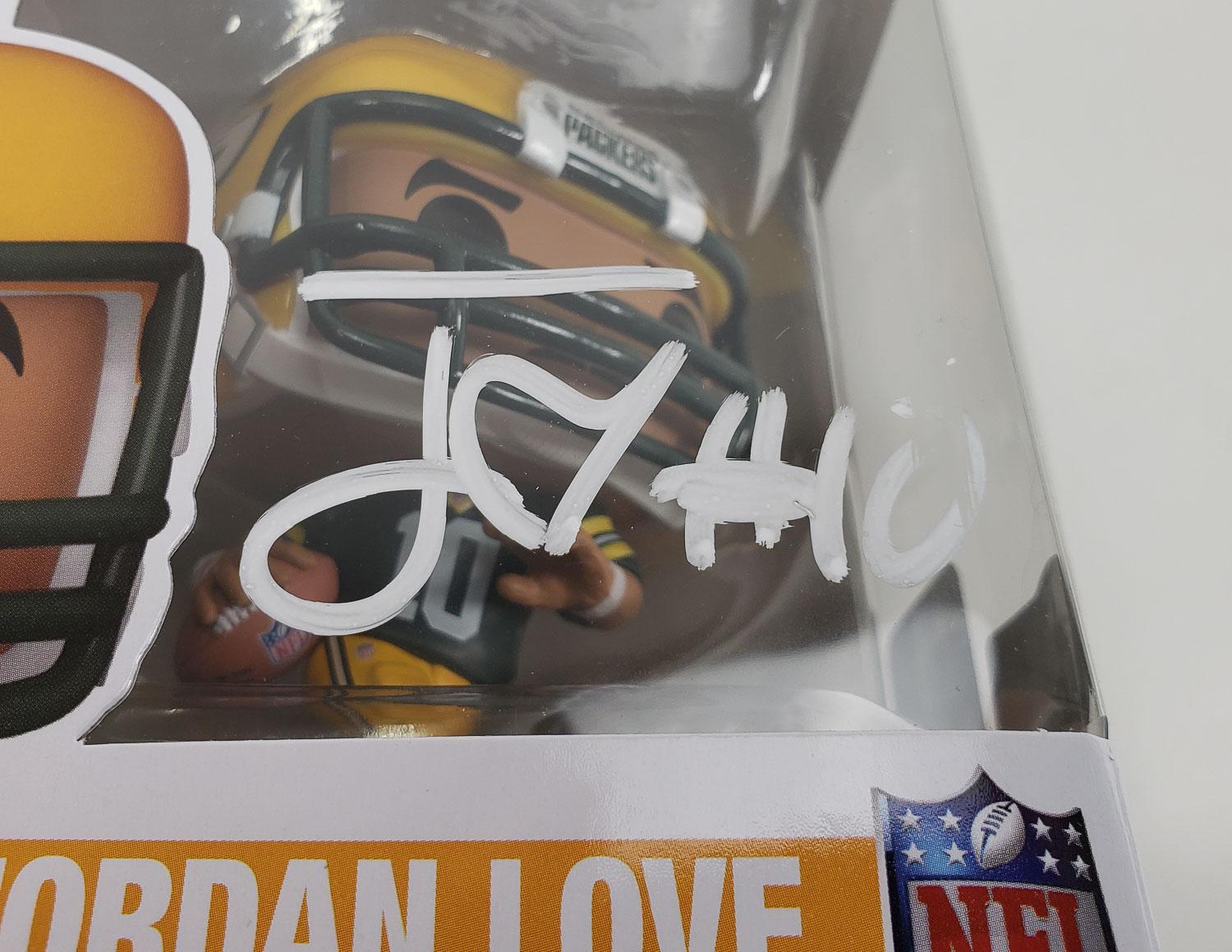 This autographed Funko Pop has been personally hand-signed by Jordan Love of the Green Bay Packers. This autograph is certified by Beckett Authentication Services (BAS) Witness Certification. That means that a Beckett representative was present when this item was signed. It comes with the numbered authentication hologram with a QR code that verifies the authentication on the Beckett website.