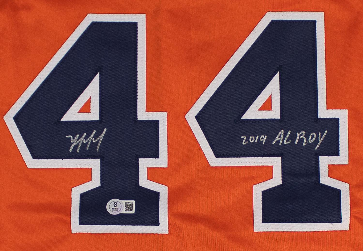 This autographed jersey has been personally hand-signed by Yordan Alvarez "2019 AL ROY" of the Houston Astros. This autograph is certified by Beckett Authentication Services (BAS) Witness Certification. That means that a Beckett representative was present when this item was signed. It comes with the numbered authentication hologram with a QR code that verifies the authentication on the Beckett website.