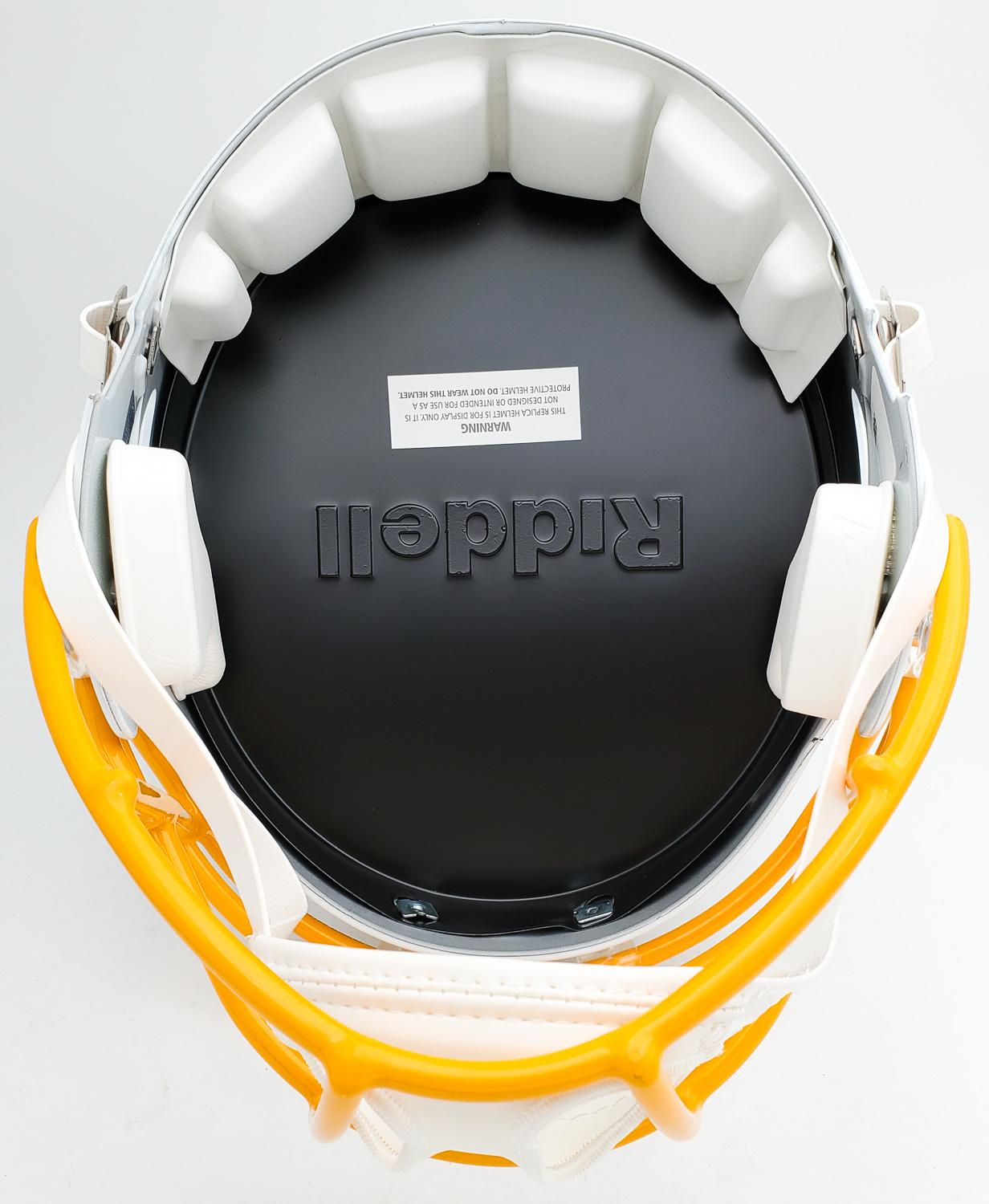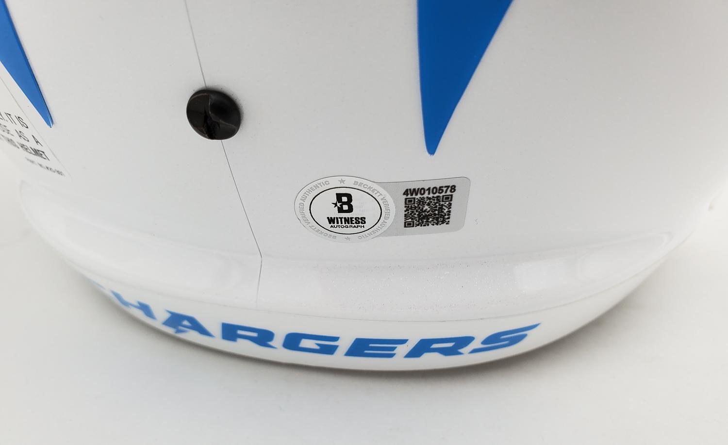 This autographed full size helmet has been personally hand-signed by Ladainian Tomlinson of the San Diego Chargers. This autograph is certified by Beckett Authentication Services (BAS) Witness Certification. That means that a Beckett representative was present when this item was signed. It comes with the numbered authentication hologram with a QR code that verifies the authentication on the Beckett website.