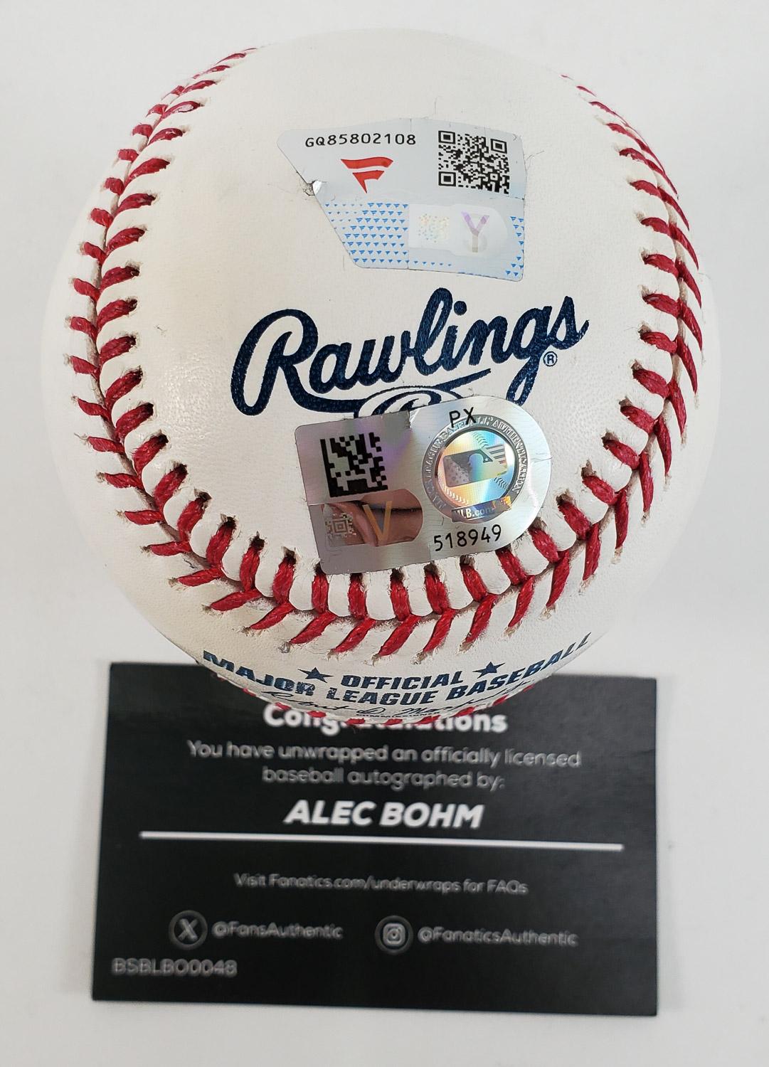 This autographed OML baseball has been personally hand-signed by Alec Bohm of the Philadelphia Phillies. This autograph is certified by Fanatics. It comes with the numbered hologram which can be verified on Fanatics.com. This autograph is also certified by Major League Baseball (MLB). It comes with the numbered hologram which can be verified on the MLB website, MLB.com. Please see all photos regarding the condition of this baseball.