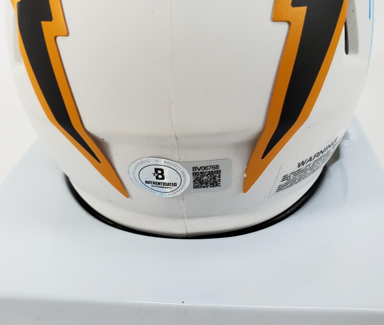 This autographed Riddell Speed mini helmet has been personally hand-signed by Justin Herbert of the Los Angeles Chargers. This autograph is certified by Beckett Authentication Services (BAS). It comes with the numbered authentication hologram with a QR code that verifies the authentication on the Beckett website. Stock images are used for this listing. The item you will receive will be of equal quality to the one pictured. The signature location may vary slightly.