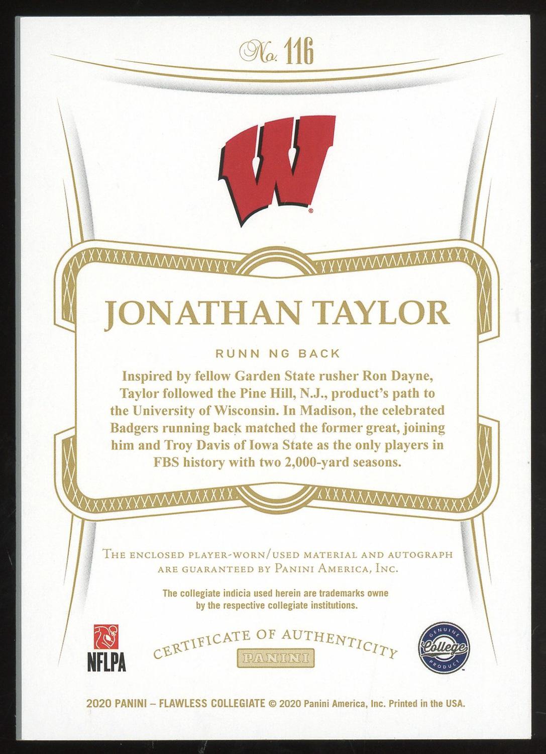Jonathan Taylor 2020 Panini Flawless Player Worn Bowl Patch Rookie Auto Card /20. Please see pictures for details on the condition of this card.
