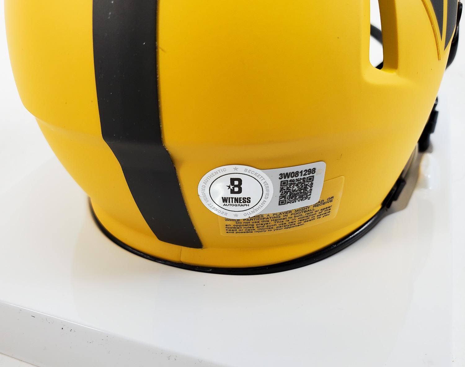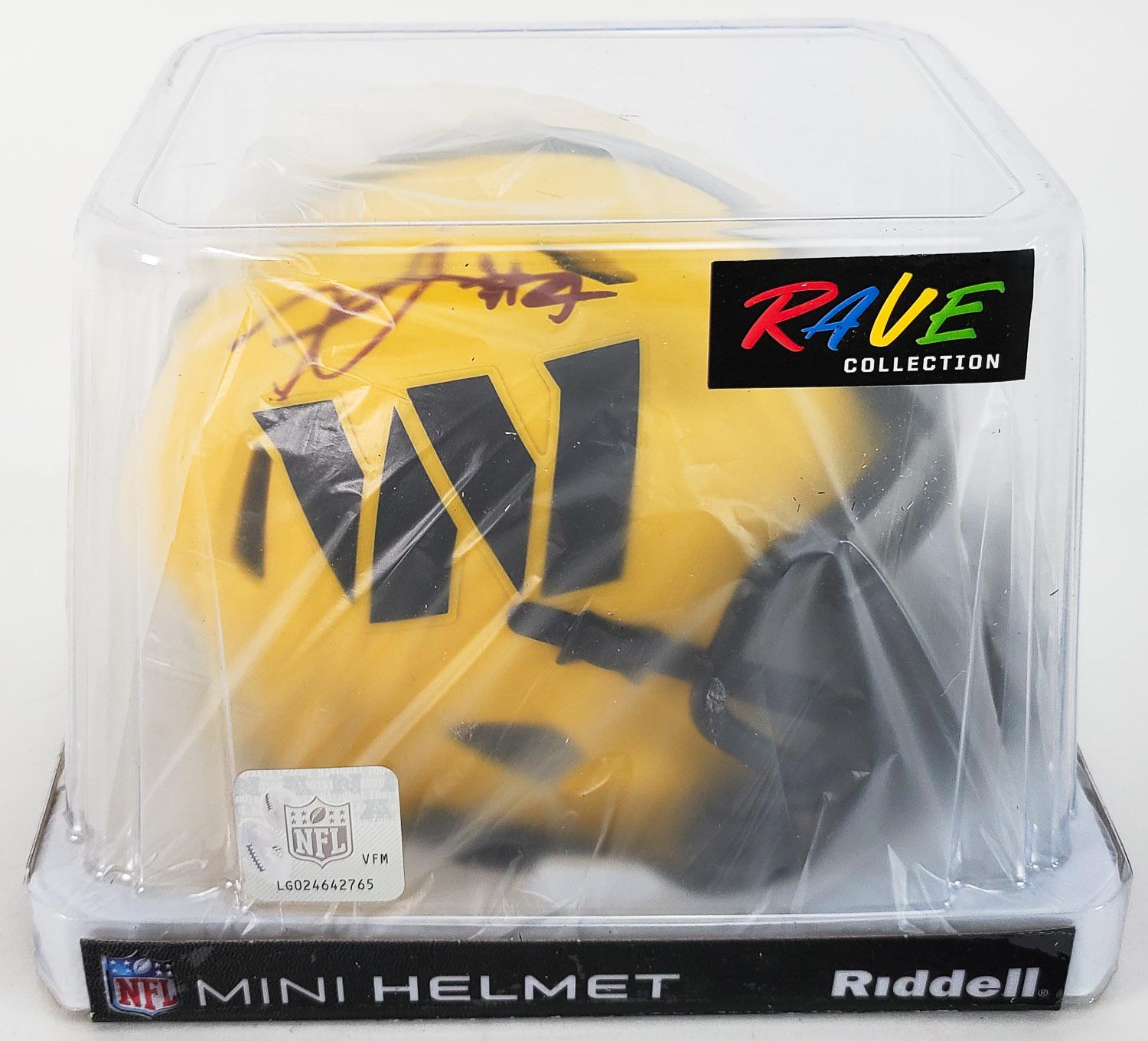 This autographed Riddell Speed mini helmet has been personally hand-signed by Frankie Luvu of the Washington Commanders. This autograph is certified by Beckett Authentication Services (BAS) Witness Certification. That means that a Beckett representative was present when this item was signed. It comes with the numbered authentication hologram with a QR code that verifies the authentication on the Beckett website.