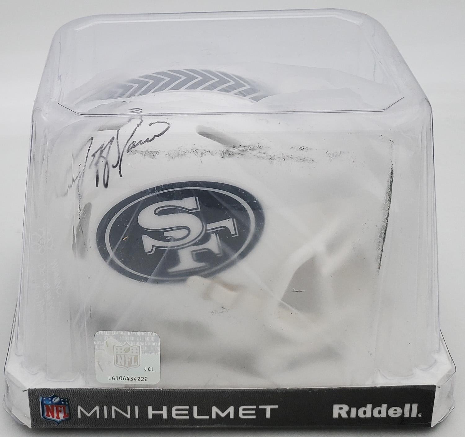 This autographed Riddell Speed mini helmet has been personally hand-signed by Jeff Garcia of the San Francisco 49ers. This autograph is certified by James Spence Authentication's (JSA) Witnessed Protection Program. That means that a JSA representative was present when this item was signed. It comes with the numbered authentication hologram with a QR code that verifies the authentication on the JSA website.