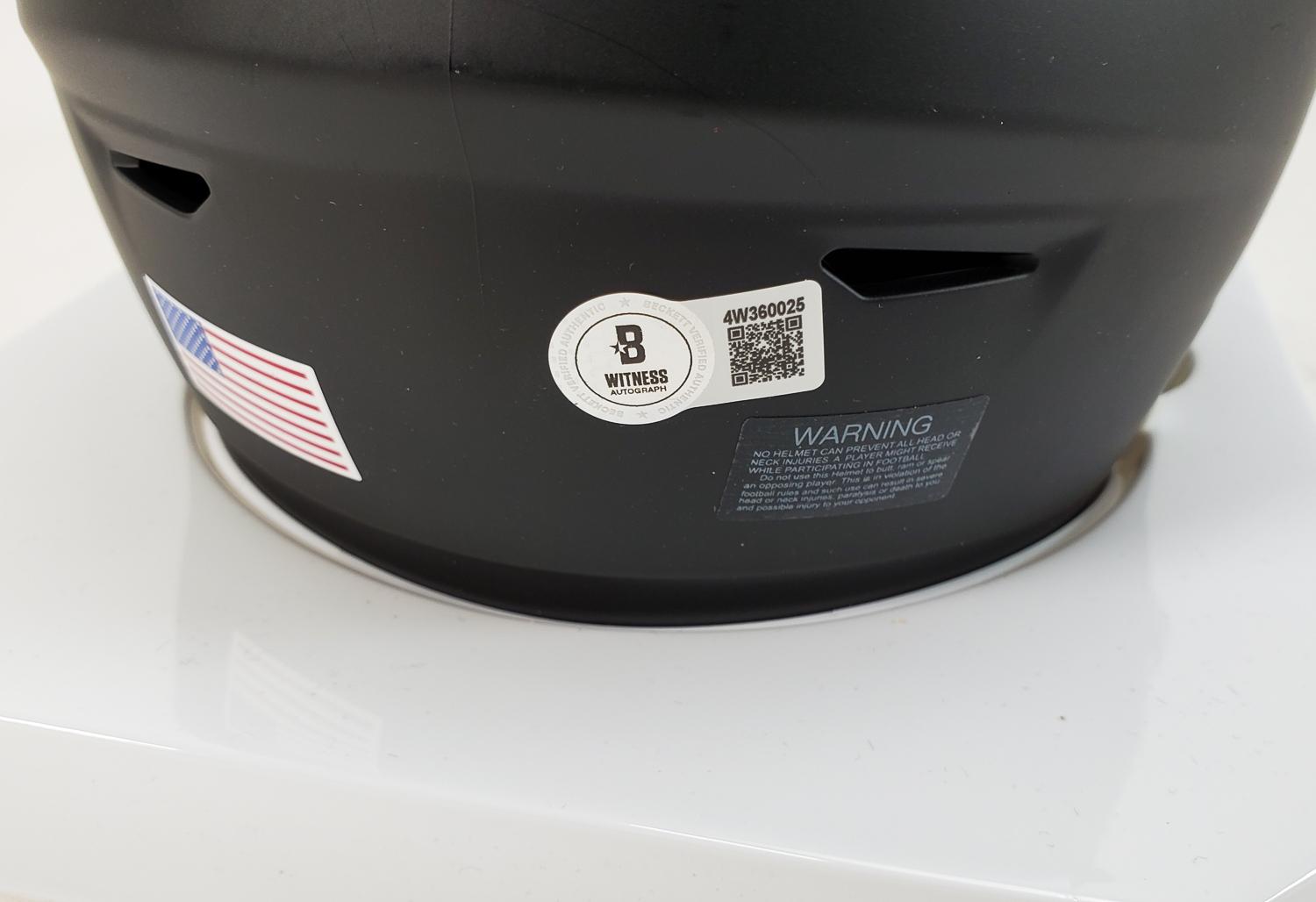 This autographed Riddell mid size MIDI helmet has been personally hand-signed by Bijan Robinson of the Atlanta Falcons. This autograph is certified by Beckett Authentication Services (BAS) Witness Certification. That means that a Beckett representative was present when this item was signed. It comes with the numbered authentication hologram with a QR code that verifies the authentication on the Beckett website.