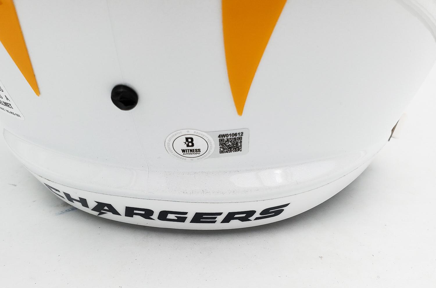 This autographed full size Riddell Speed helmet has been personally hand-signed by Ladainian Tomlinson "HOF 17" of the Los Angeles Chargers. This autograph is certified by Beckett Authentication Services (BAS) Witness Certification. That means that a Beckett representative was present when this item was signed. It comes with the numbered authentication hologram with a QR code that verifies the authentication on the Beckett website.