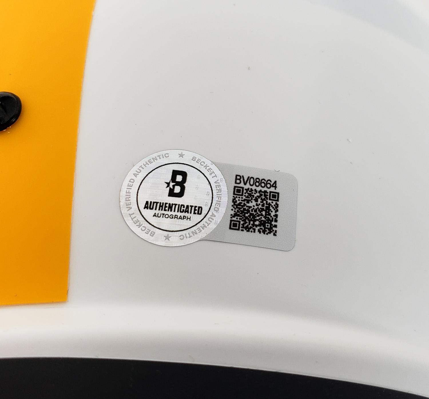 This autographed full size helmet has been personally hand-signed by Terry Bradshaw of the Pittsburgh Steelers. This autograph is certified by Beckett Authentication Services (BAS) Certification. It comes with the numbered authentication hologram with a QR code that verifies the authentication on the Beckett website.