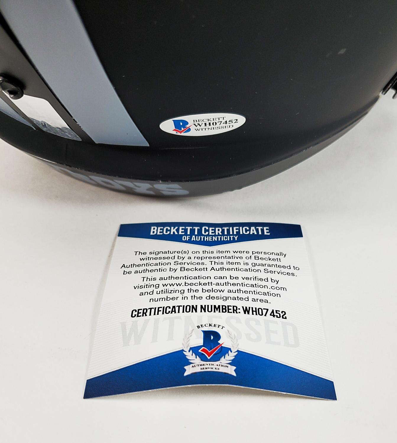This autographed full size helmet has been personally hand-signed by Troy Aikman of the Dallas Cowboys. This autograph is certified by Beckett Authentication Services (BAS) Witness Certification. That means that a Beckett representative was present when this item was signed. It comes with the numbered hologram and matching Certificate of Authenticity.