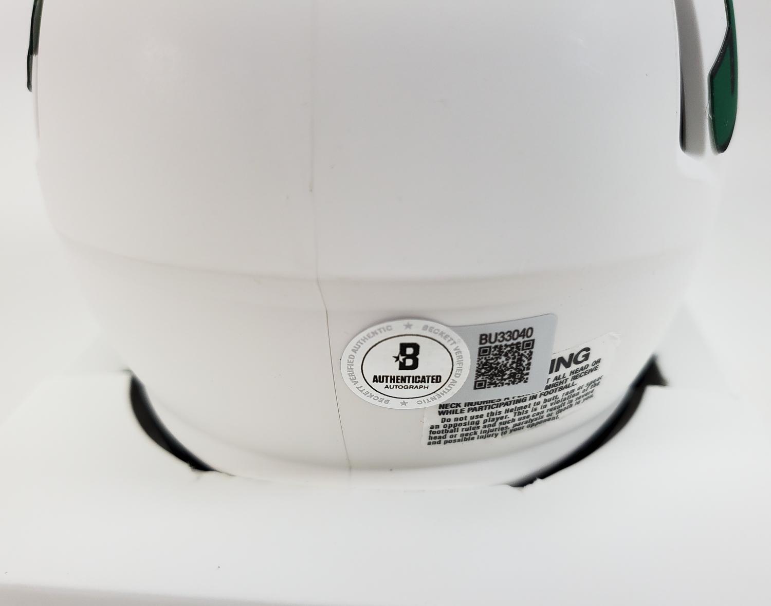 This autographed Riddell Speed mini helmet has been personally hand-signed by Zach Wilson of the New York Jets. This autograph is certified by Beckett Authentication Services (BAS). It comes with the numbered authentication hologram with a QR code that verifies the authentication on the Beckett website. Stock images are used for this listing. The item you will receive will be of equal quality to the one pictured. The signature location may vary slightly.
