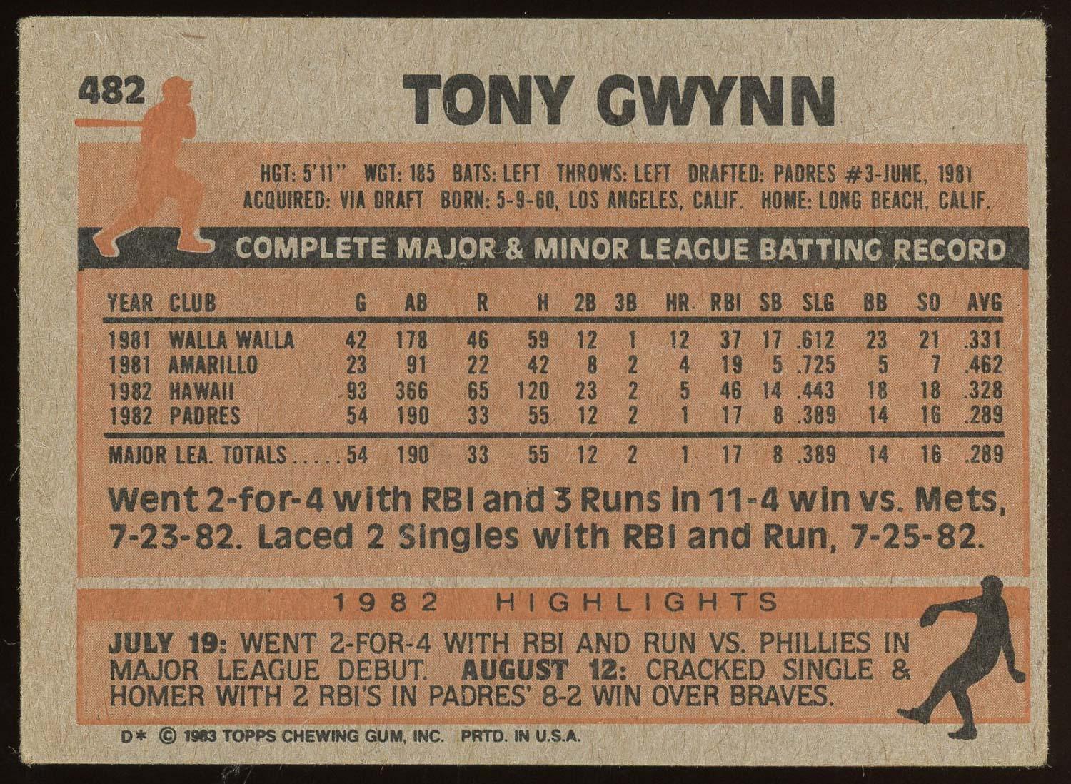 Tony Gwynn 1983 Topps Rookie Card #482