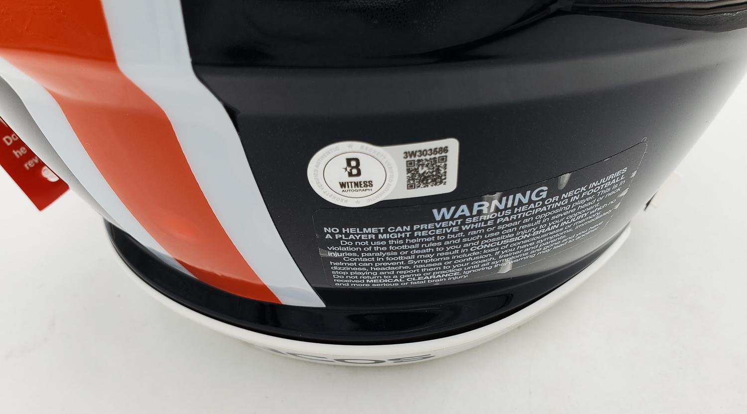 This autographed full size Riddell authentic Speed helmet has been personally hand-signed by John Elway of the Denver Broncos. This autograph is certified by Beckett Authentication Services (BAS) Witness Certification. That means that a Beckett representative was present when this item was signed. It comes with the numbered authentication hologram with a QR code that verifies the authentication on the Beckett website.