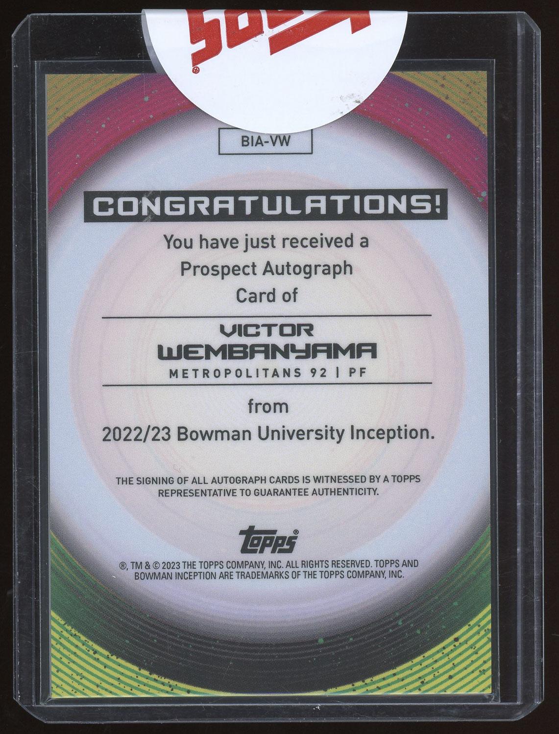 Victor Wembanyama 2022 Bowman University Inception 1st Initiation Prospect Auto Card. Please see pictures for details on the condition of this card.