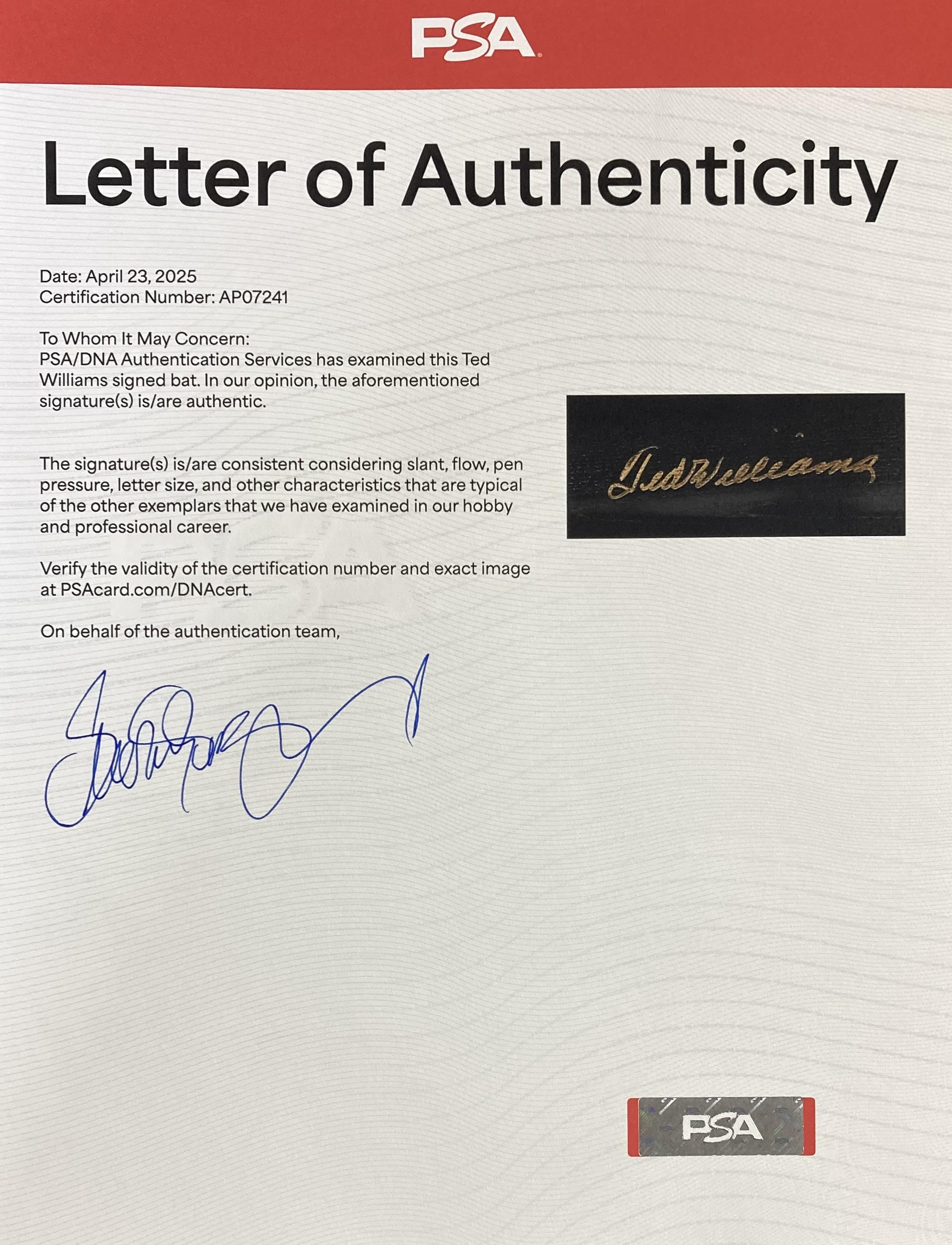 This autographed baseball bat has been personally hand-signed by Ted Williams of the Boston Red Sox. This autograph is certified by PSA/DNA (Professional Sports Authenticators). It comes with the numbered authentication hologram which can be verified on the PSA website, psacard.com.