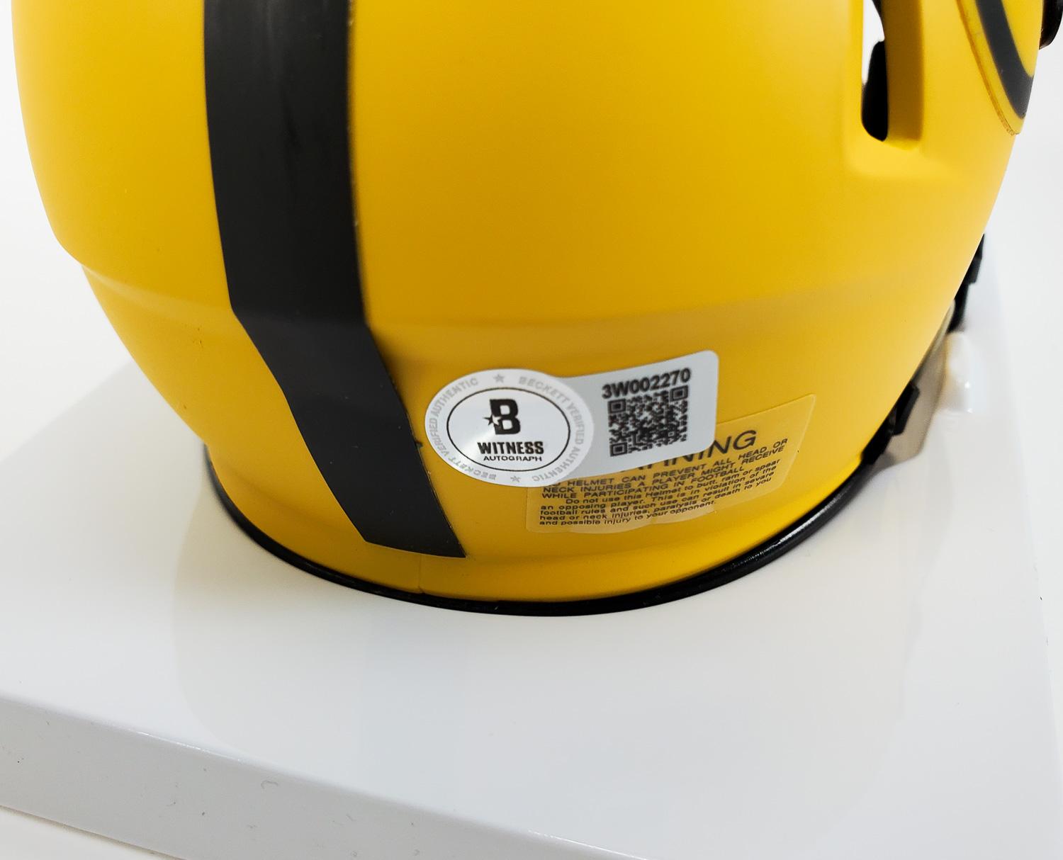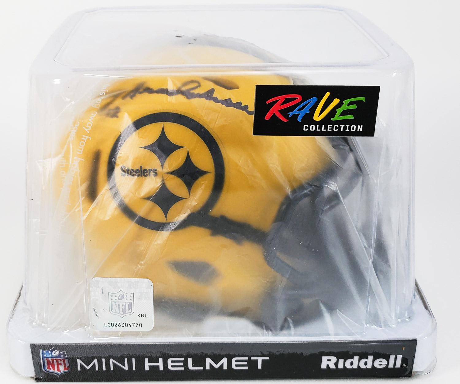 This autographed Riddell Speed mini helmet has been personally hand-signed by Terry Bradshaw of the Pittsburgh Steelers. This autograph is certified by Beckett Authentication Services (BAS) Witness Certification. That means that a Beckett representative was present when this item was signed. It comes with the numbered authentication hologram with a QR code that verifies the authentication on the Beckett website. Stock images are used for this listing. The item you will receive will be of equal quality to the one pictured. The signature location may vary slightly.