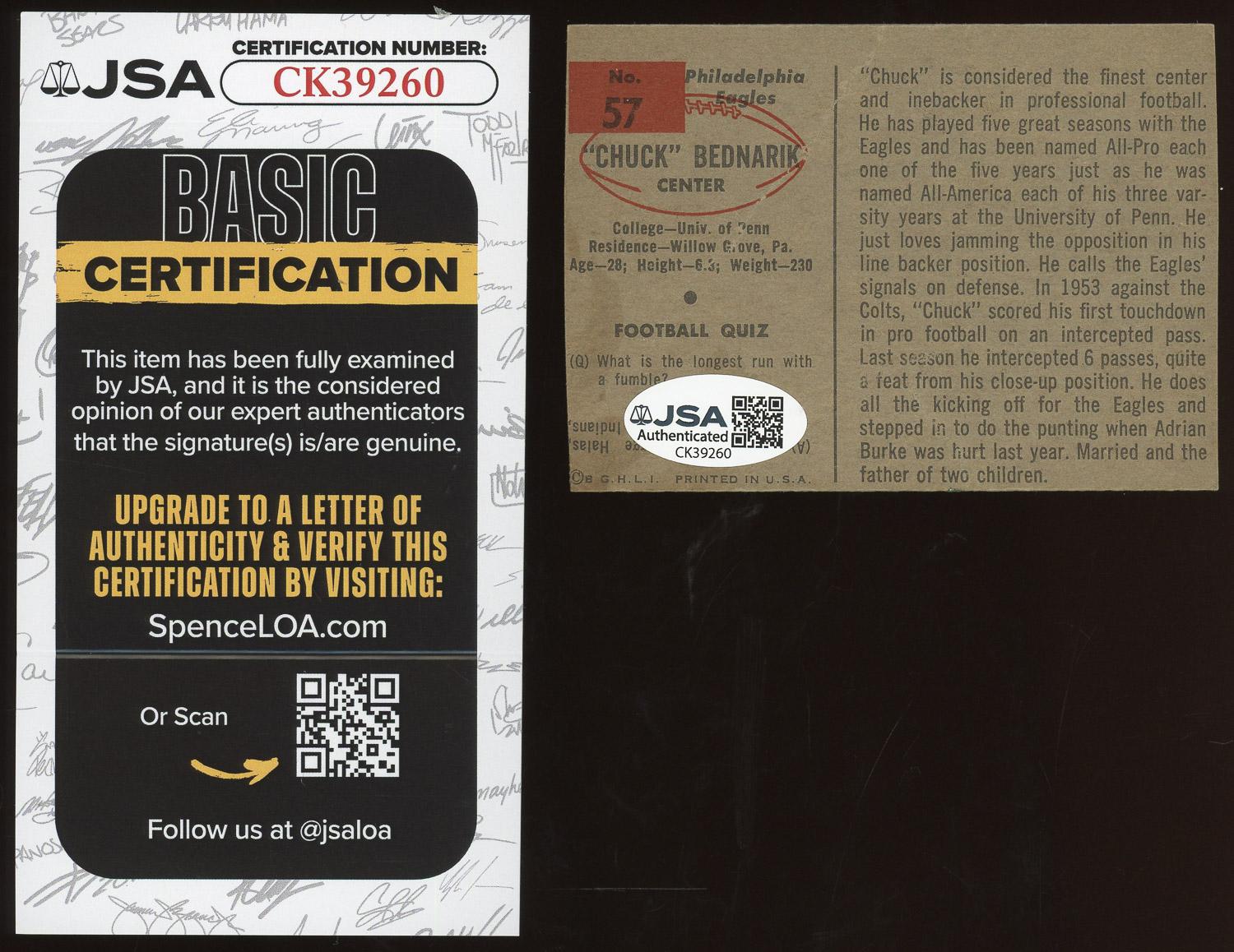 Chuck Bednarik (d.2015) Signed 1954 Bowman Card #57 (JSA COA). This autograph is certified by James Spence Authentication (JSA). It comes with the numbered hologram and matching Certificate of Authenticity. Please see pictures for details on the condition of this card.