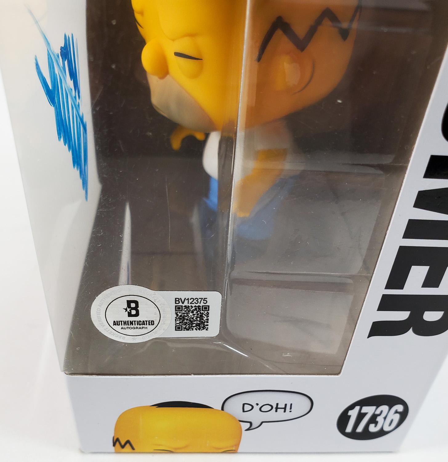 This autographed Funko Pop has been personally hand-signed by Dan Castellaneta from The Simpsons. This autograph is certified by Beckett Authentication Services (BAS) Certification. It comes with the numbered authentication hologram with a QR code that verifies the authentication on the Beckett website.
