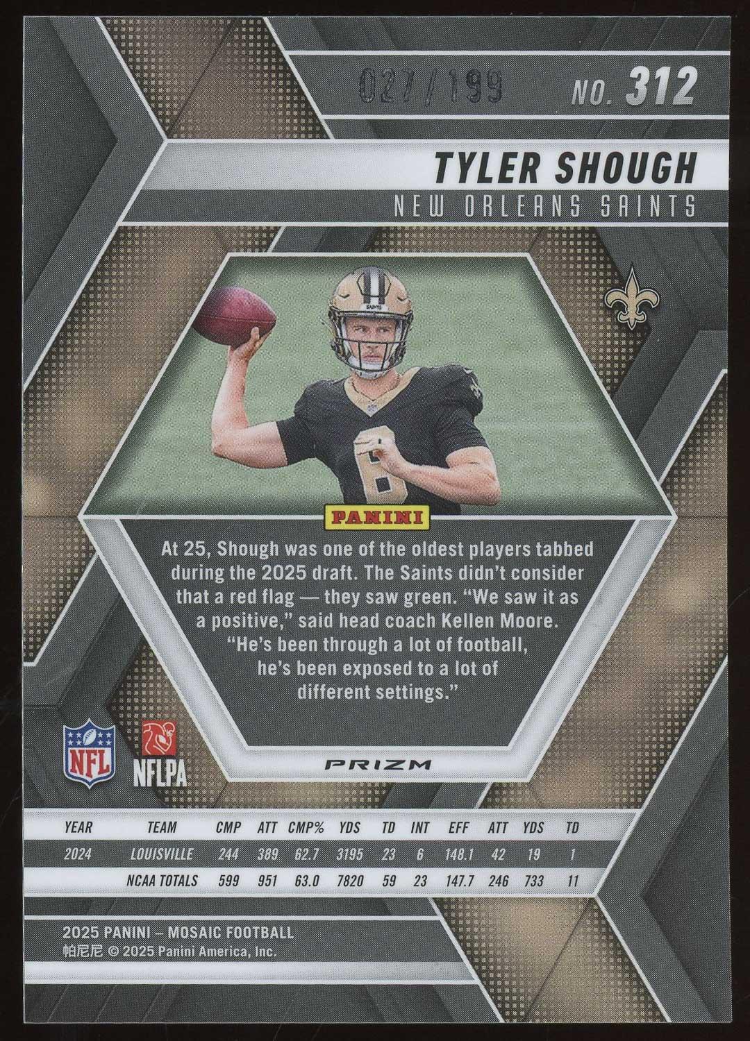 Tyler Shough 2025 Panini Mosaic Orange Rookie Card /199. Please see pictures for details on the condition of this card.