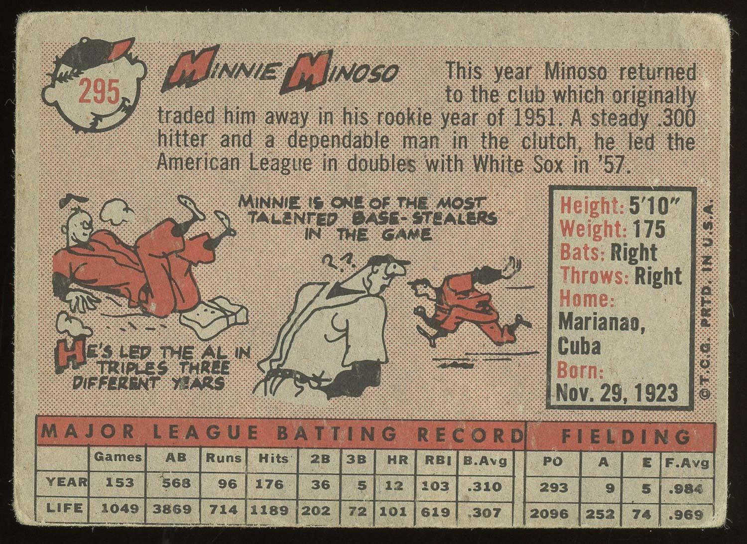 Minnie Minoso 1958 Topps Card #295. Please see pictures for details on the condition of this card.