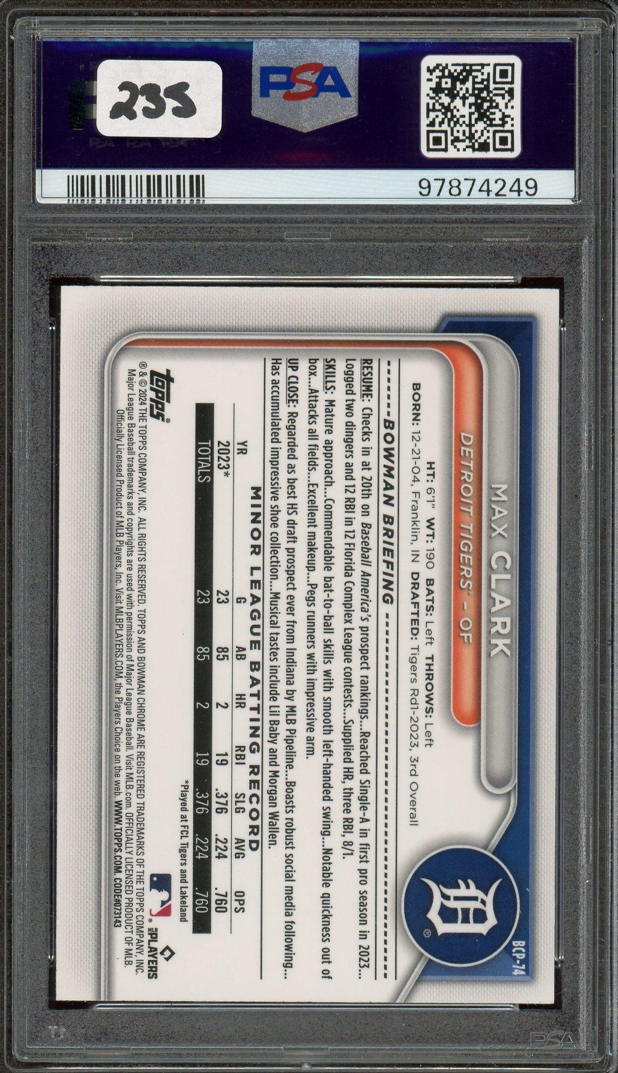 Max Clark 2024 Bowman Sapphire Chrome Prospect Orange Card /25 PSA Gem Mint 10 POP 11!