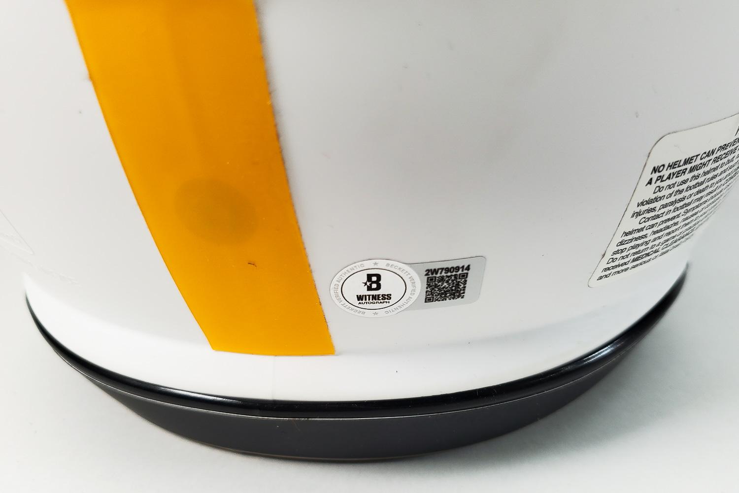 This autographed full size helmet has been personally hand-signed by TJ Watt of the Pittsburgh Steelers. This autograph is certified by Beckett Authentication Services (BAS) Witness Certification. That means that a Beckett representative was present when this item was signed. It comes with the numbered hologram and matching Certificate of Authenticity.