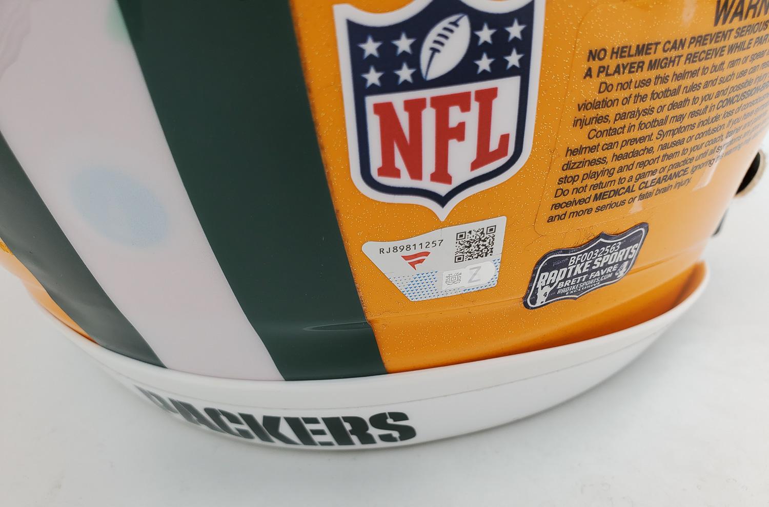 This autographed full size Riddell SpeedFlex authentic speed helmet has been personally hand-signed by Brett Favre of the Green Bay Packers. This autograph is certified by Fanatics. It comes with the numbered hologram which can be verified on Fanatics.com. This autograph is certified by Radtke Sports. It comes with the numbered authentication hologram, which can be verified on their website, Radtkesports.com.