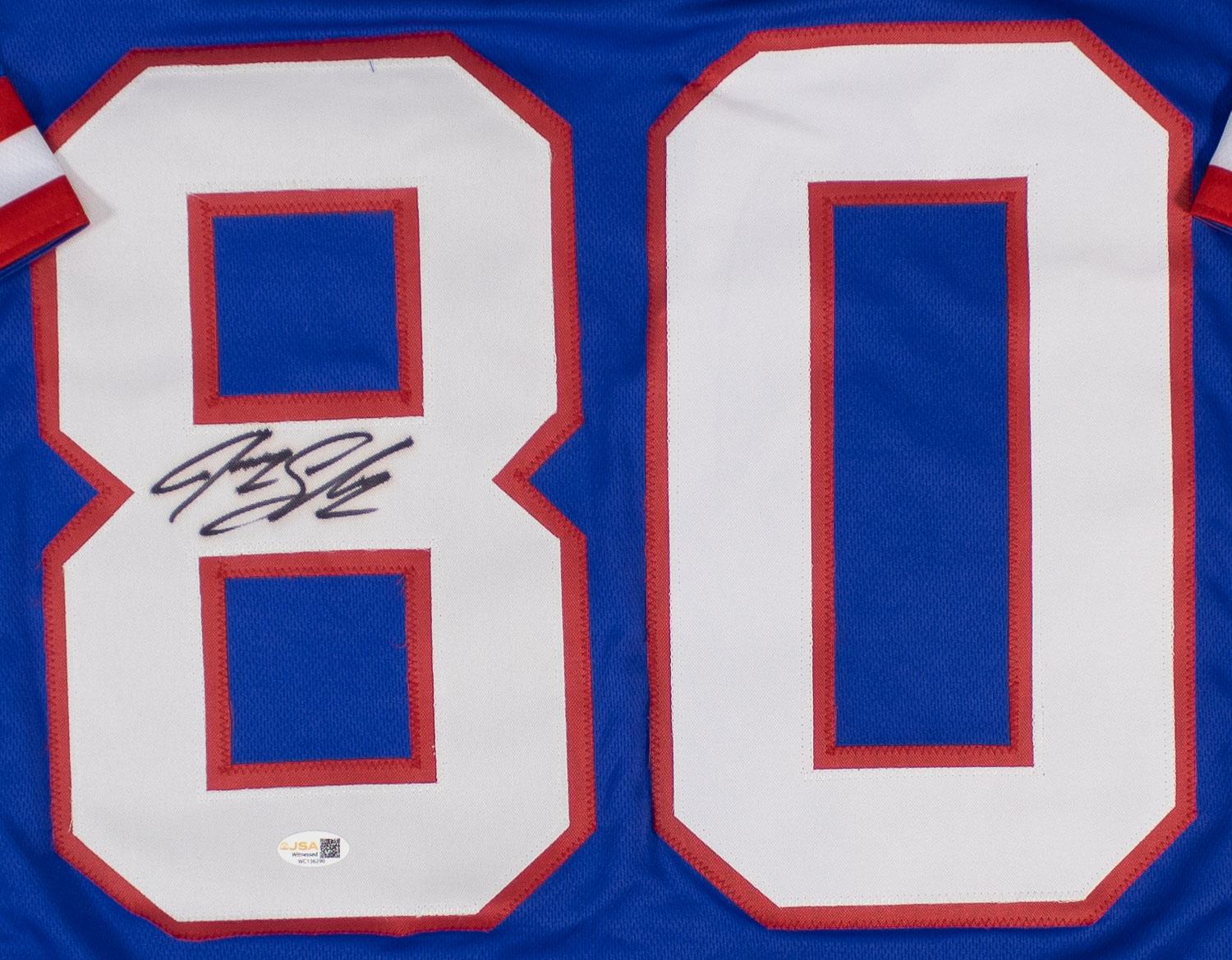 This autographed jersey has been personally hand-signed by Jeremy Shockey of the New York Giants. This autograph is certified by James Spence Authentication's (JSA) Witnessed Protection Program. That means that a JSA representative was present when this item was signed. It comes with the numbered authentication hologram with a QR code that verifies the authentication on the JSA website.
