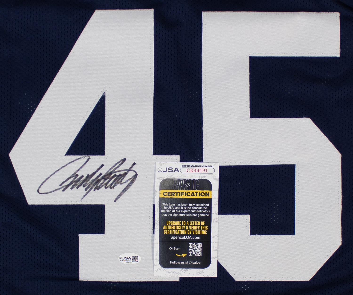 This autographed jersey has been personally hand-signed by Rudy Ruettiger of the Notre Dame Fighting Irish. This autograph is certified by James Spence Authentication (JSA). It comes with the numbered hologram and matching Certificate of Authenticity.