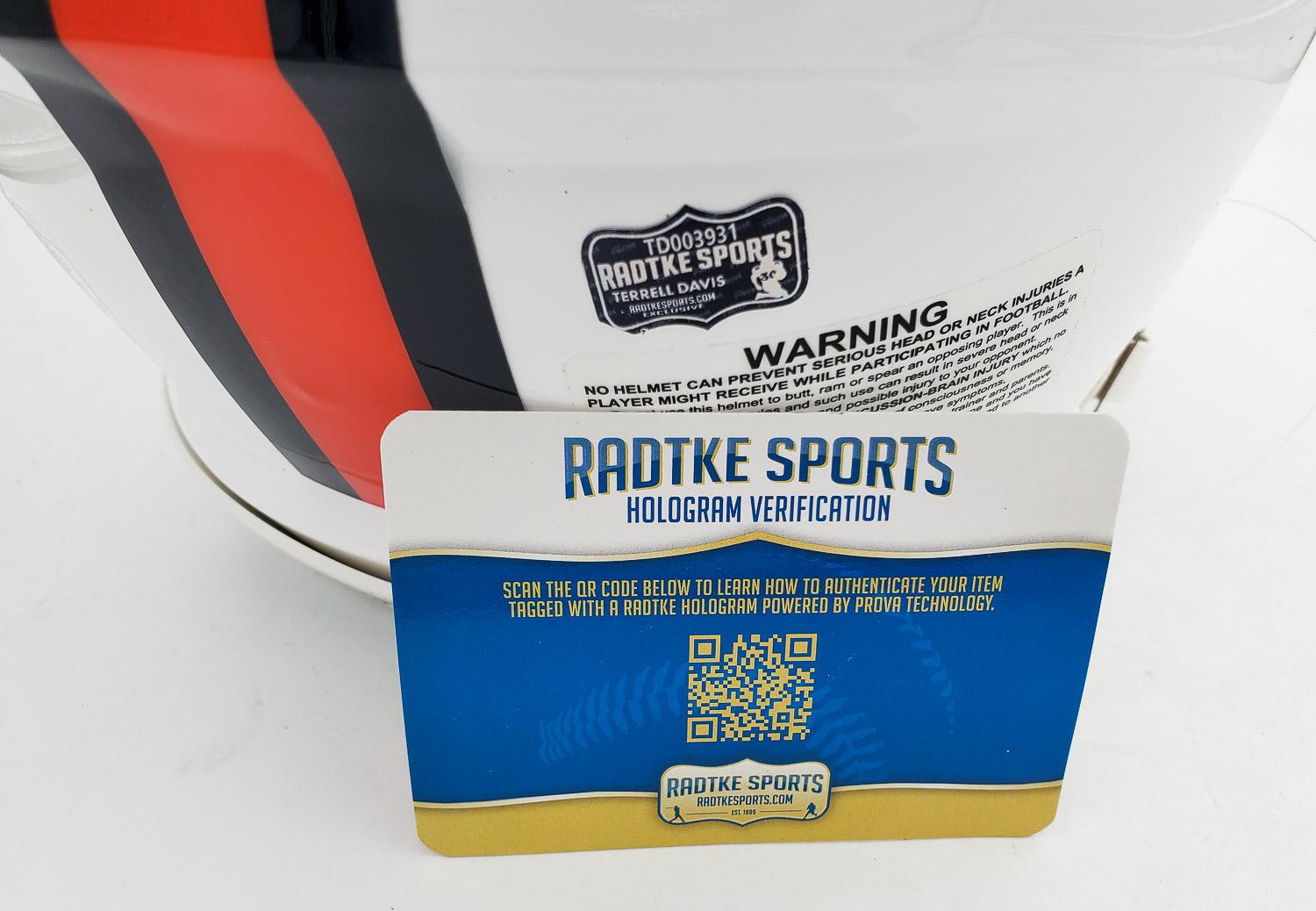 This autographed full size Riddell Authentic Speed helmet has been personally hand-signed by Terrell Davis "HOF 17" of the Denver Broncos. This autograph is certified by Radtke Sports. It comes with the Certificate of Authenticity and numbered hologram, which can be verified on their website, Radtkesports.com.