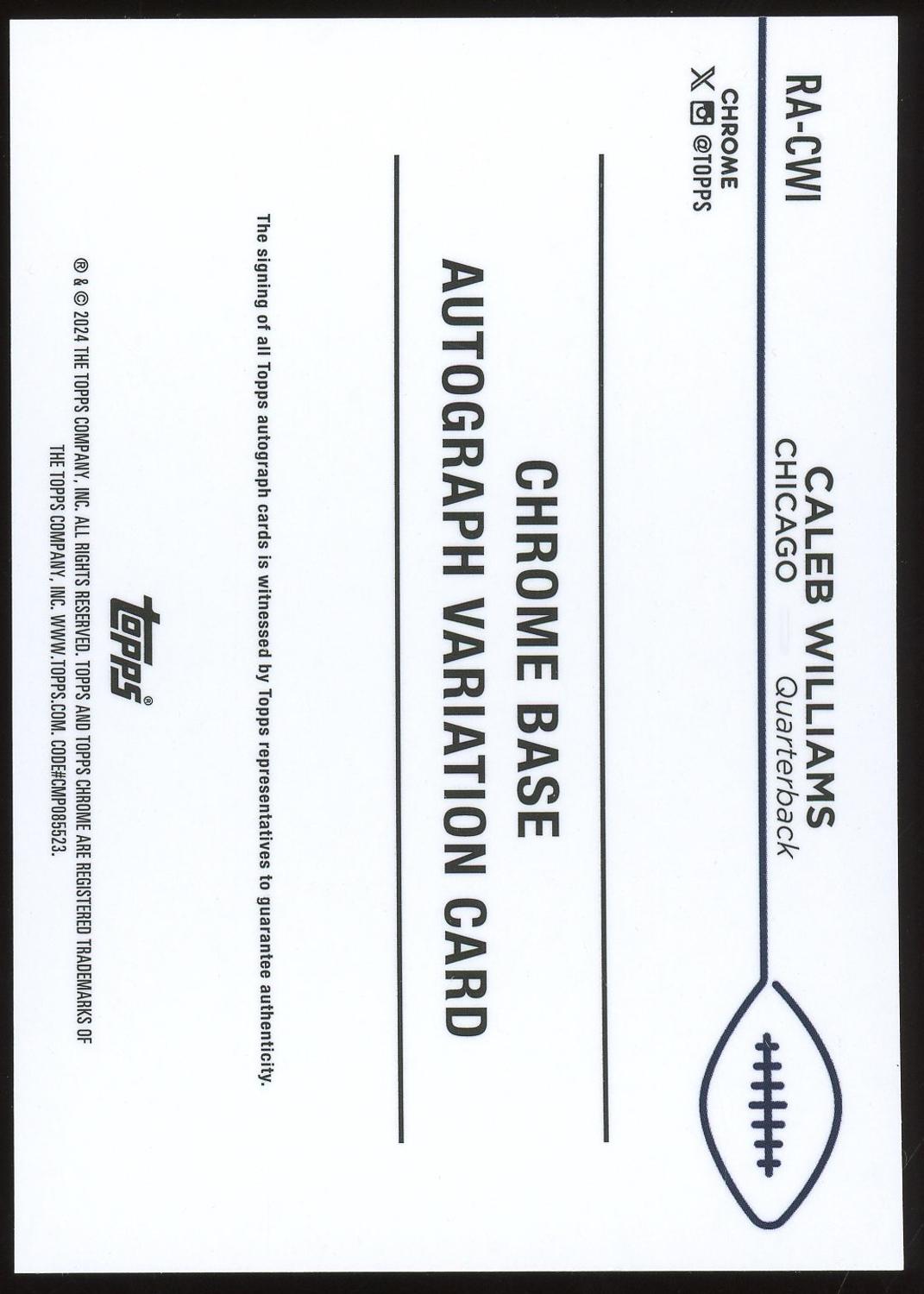 Caleb Williams 2024 Topps Chrome Refractor Variation Rookie Auto Card