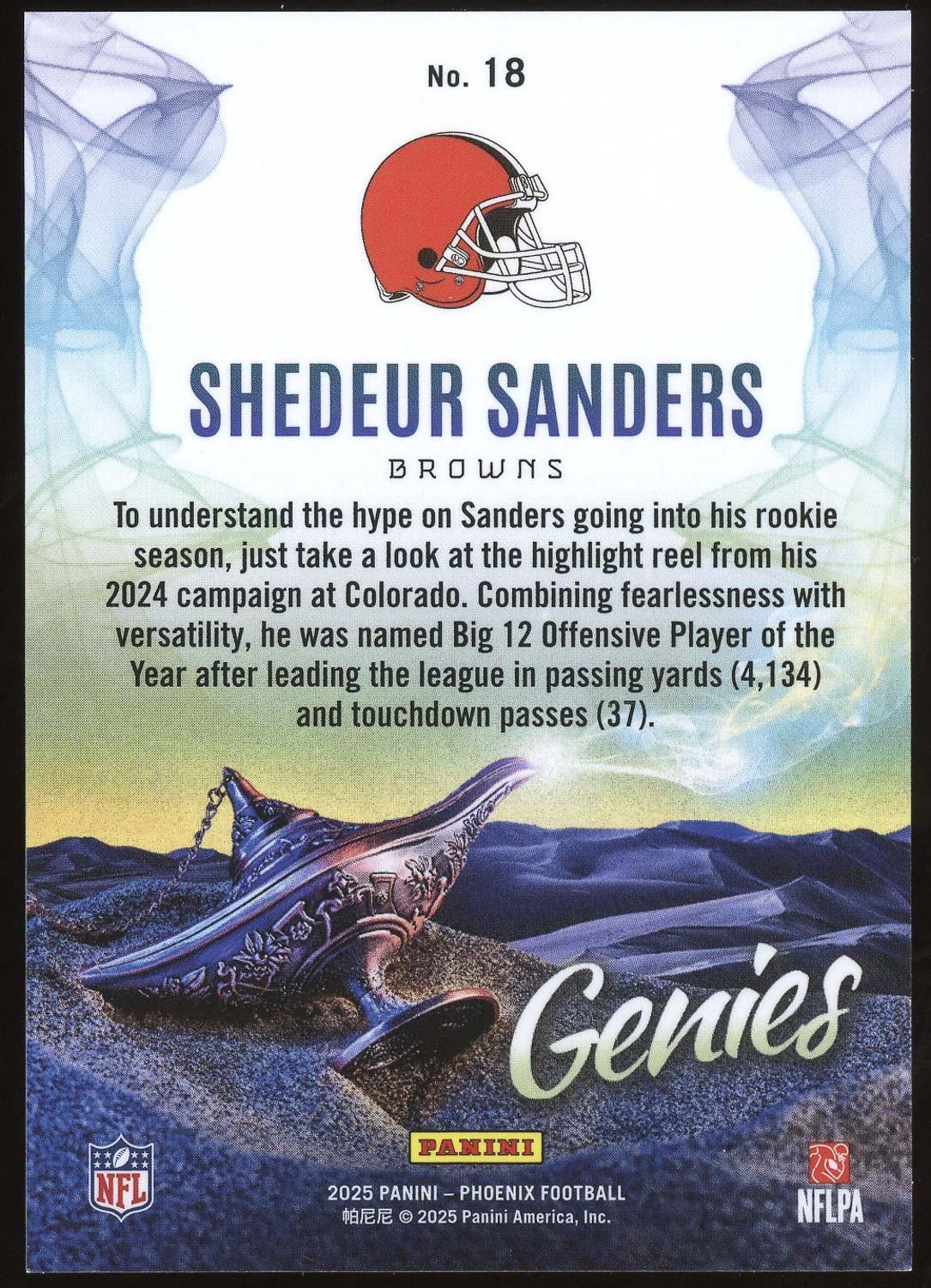 Shedeur Sanders 2025 Panini Phoenix Genies Rookie Card. Please see pictures for details on the condition of this card.