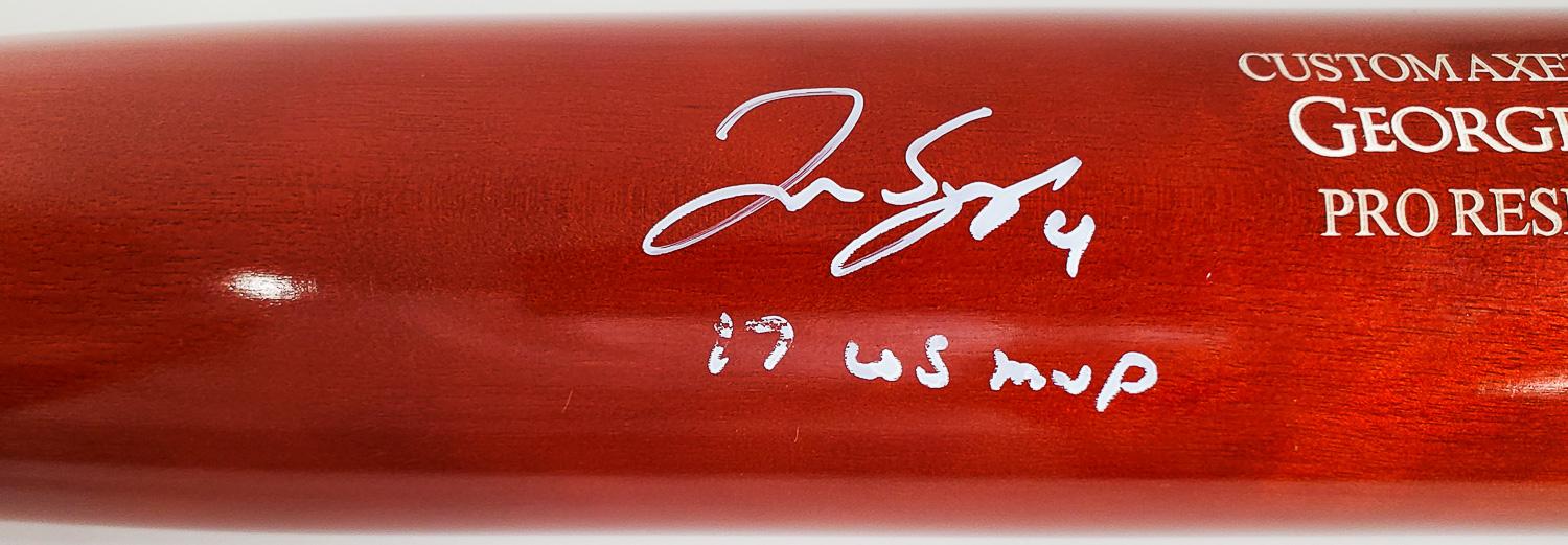 This autographed baseball bat has been personally hand-signed by George Springer of the Toronto Blue Jays and Houston Astros. Springer added "17 WS MVP" along with his signature. This autograph is certified by Major League Baseball (MLB). It comes with the numbered hologram which can be verified on the MLB website, MLB.com.