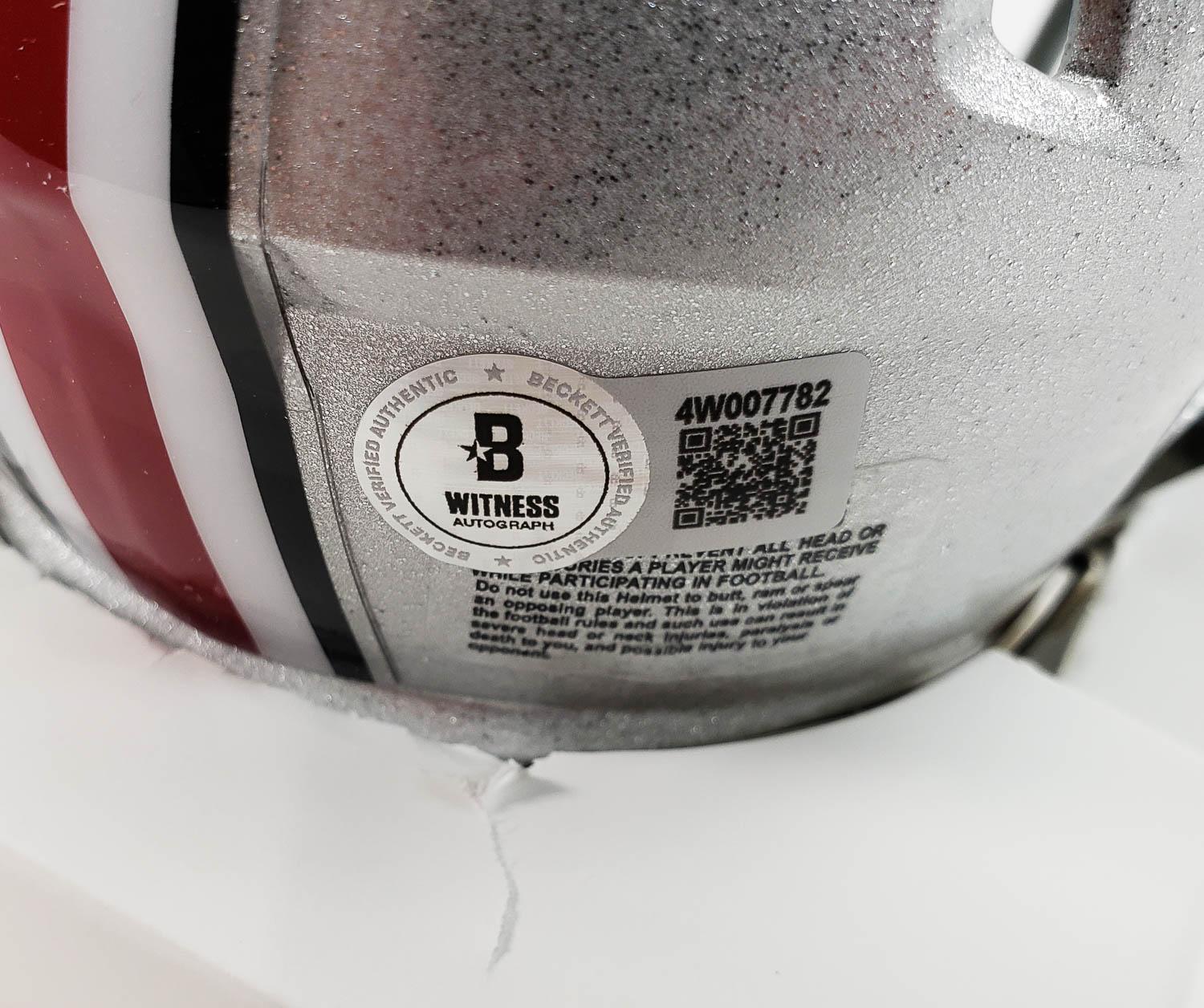 This autographed Riddell Speed mini helmet has been personally hand-signed by Justin Fields of the Ohio State Buckeyes. This autograph is certified by Beckett Authentication Services (BAS) Witness Certification. That means that a Beckett representative was present when this item was signed. It comes with the numbered authentication hologram with a QR code that verifies the authentication on the Beckett website. Stock images are used for this listing. The item you will receive will be of equal quality to the one pictured. The signature location may vary slightly.