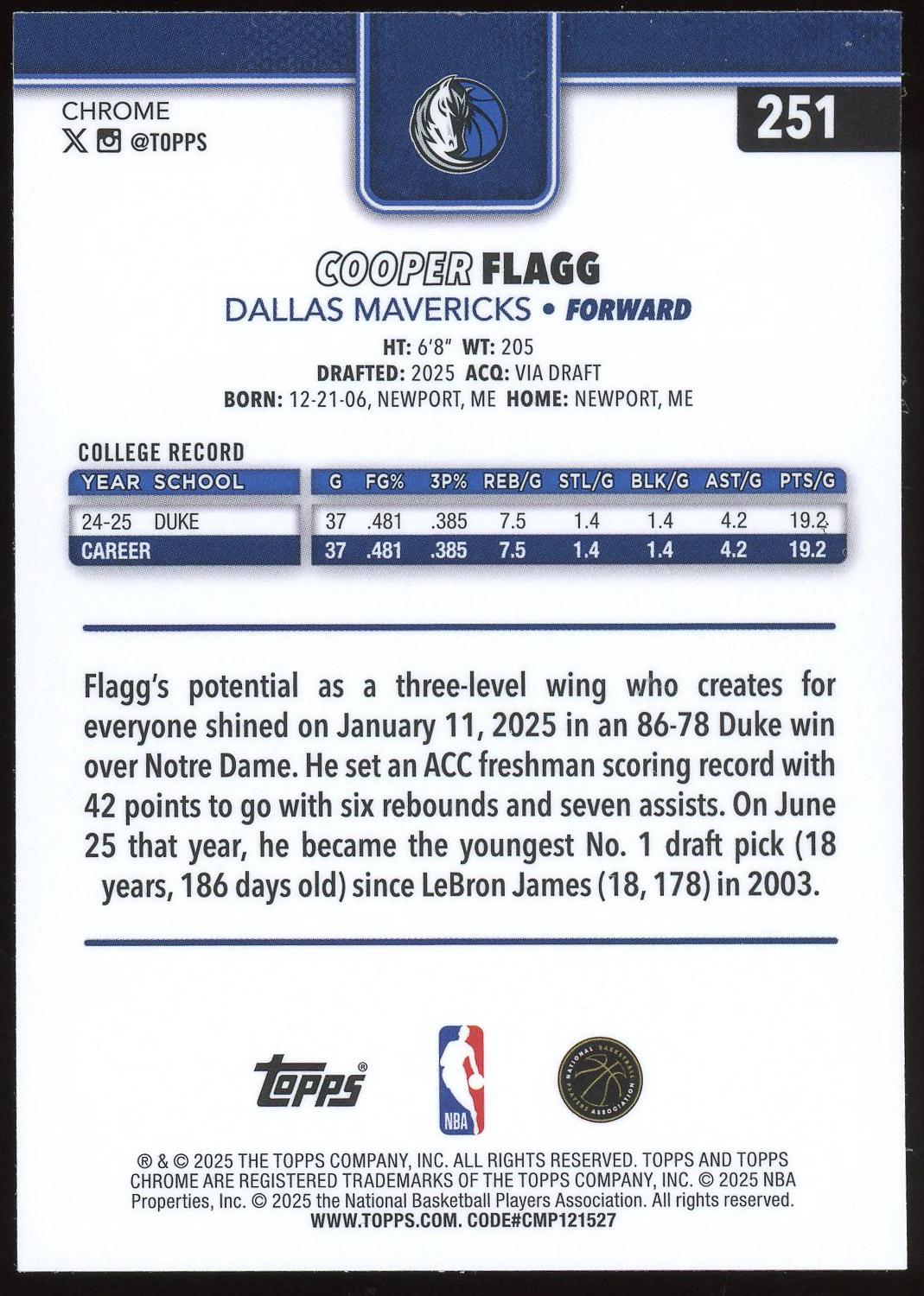 Cooper Flagg 2025 Topps Chrome Rookie Card #251