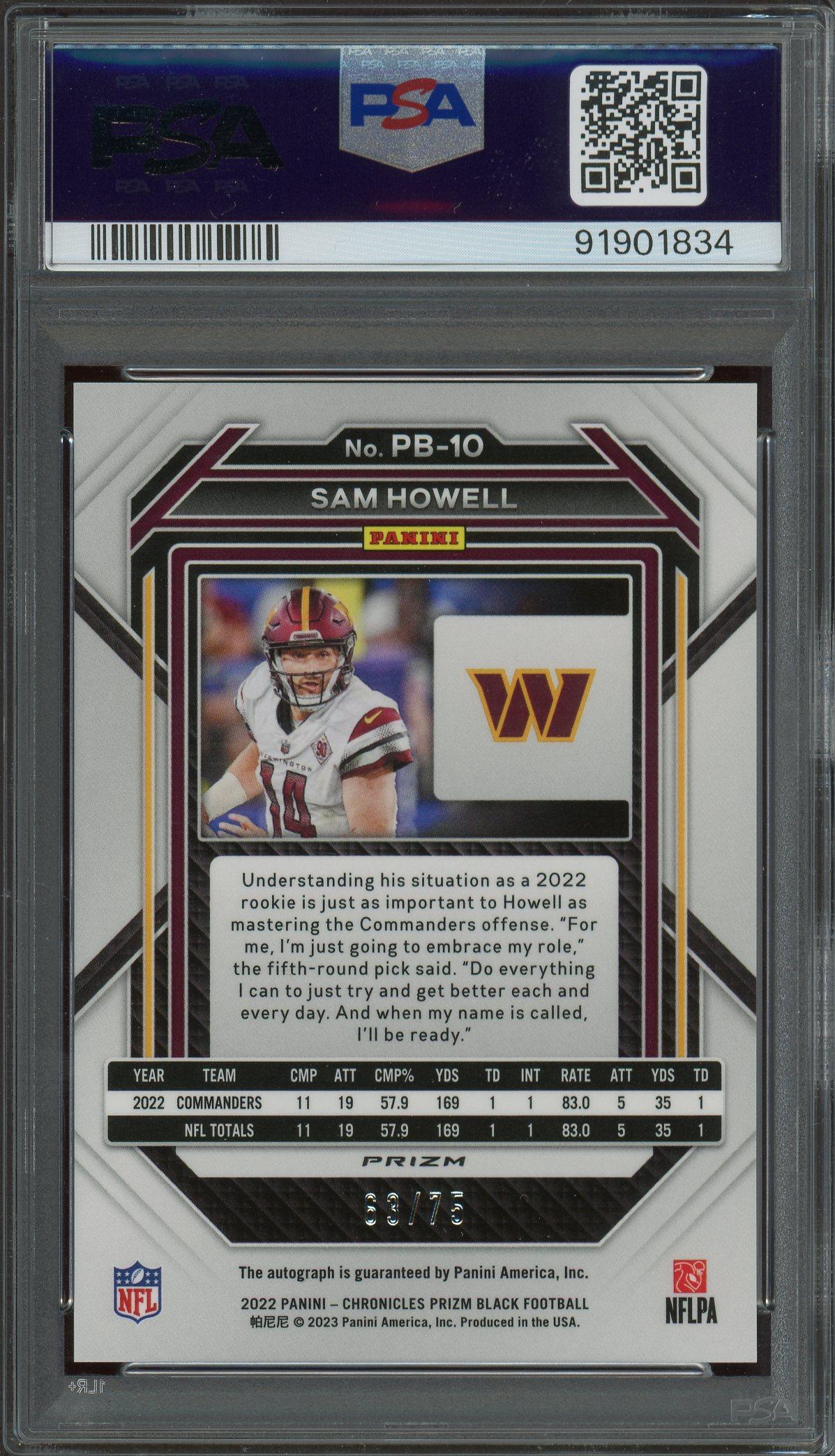 Sam Howell 2022 Panini Chronicles Prizm Black Signature Orange Rookie Auto Card /75! PSA Gem Mint 10 POP 18!
