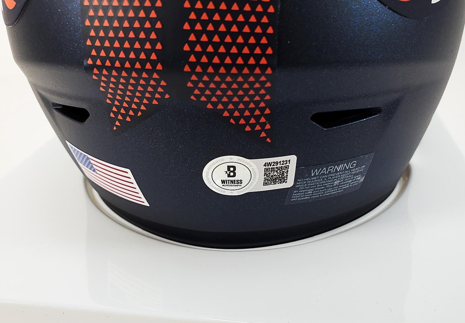 This autographed Riddell mid size MIDI helmet has been personally hand-signed by Bo Nix of the Denver Broncos. This autograph is certified by Beckett Authentication Services (BAS) Witness Certification. That means that a Beckett representative was present when this item was signed. It comes with the numbered authentication hologram with a QR code that verifies the authentication on the Beckett website.