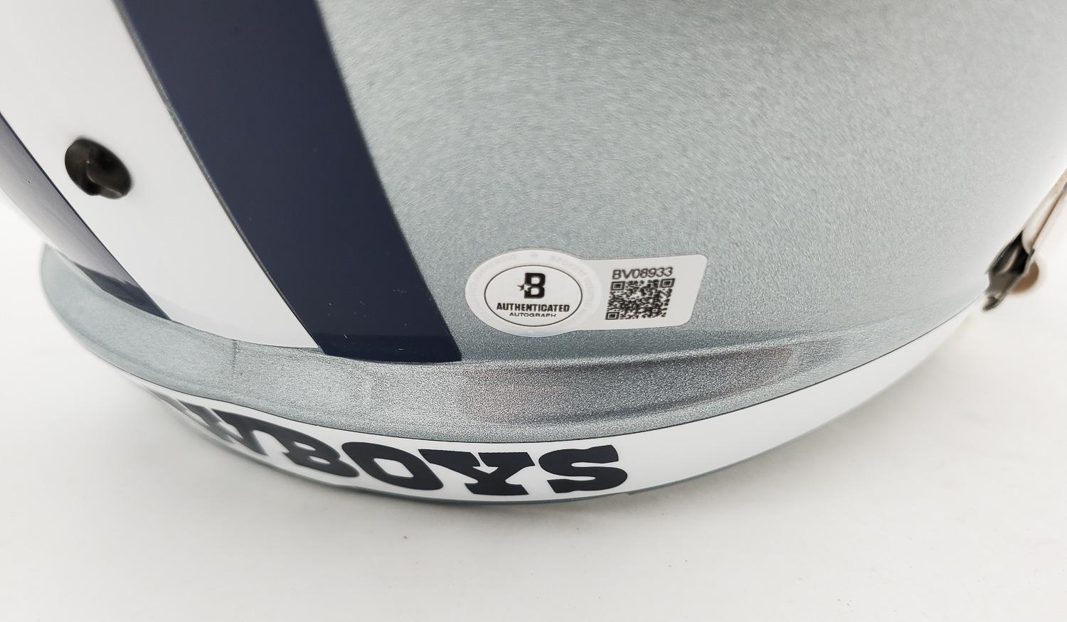 This autographed full size helmet has been personally hand-signed by Troy Aikman of the Dallas Cowboys. This autograph is certified by Beckett Authentication Services (BAS). It comes with the numbered authentication hologram with a QR code that verifies the authentication on the Beckett website. Stock images are used for this listing. The item you will receive will be of equal quality to the one pictured. The signature location may vary slightly.
