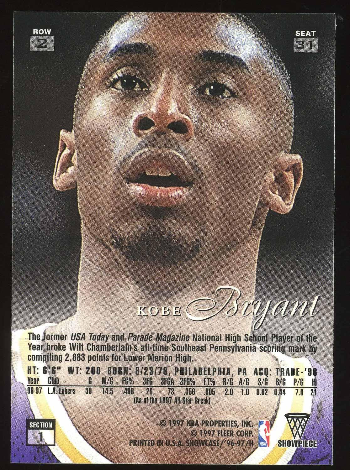 Kobe Bryant 1996 Flair Showcase Style Showpiece Rookie Card