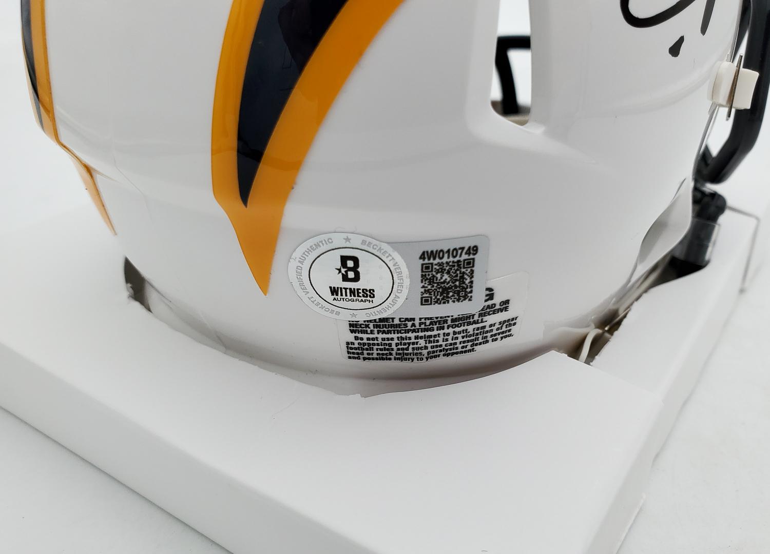 This autographed Riddell Speed mini helmet has been personally hand-signed by Ladainian Tomlinson of the San Diego Chargers. This autograph is certified by Beckett Authentication Services (BAS) Witness Certification. That means that a Beckett representative was present when this item was signed. It comes with the numbered authentication hologram with a QR code that verifies the authentication on the Beckett website. Stock images are used for this listing. The item you will receive will be of equal quality to the one pictured. The signature location may vary slightly.