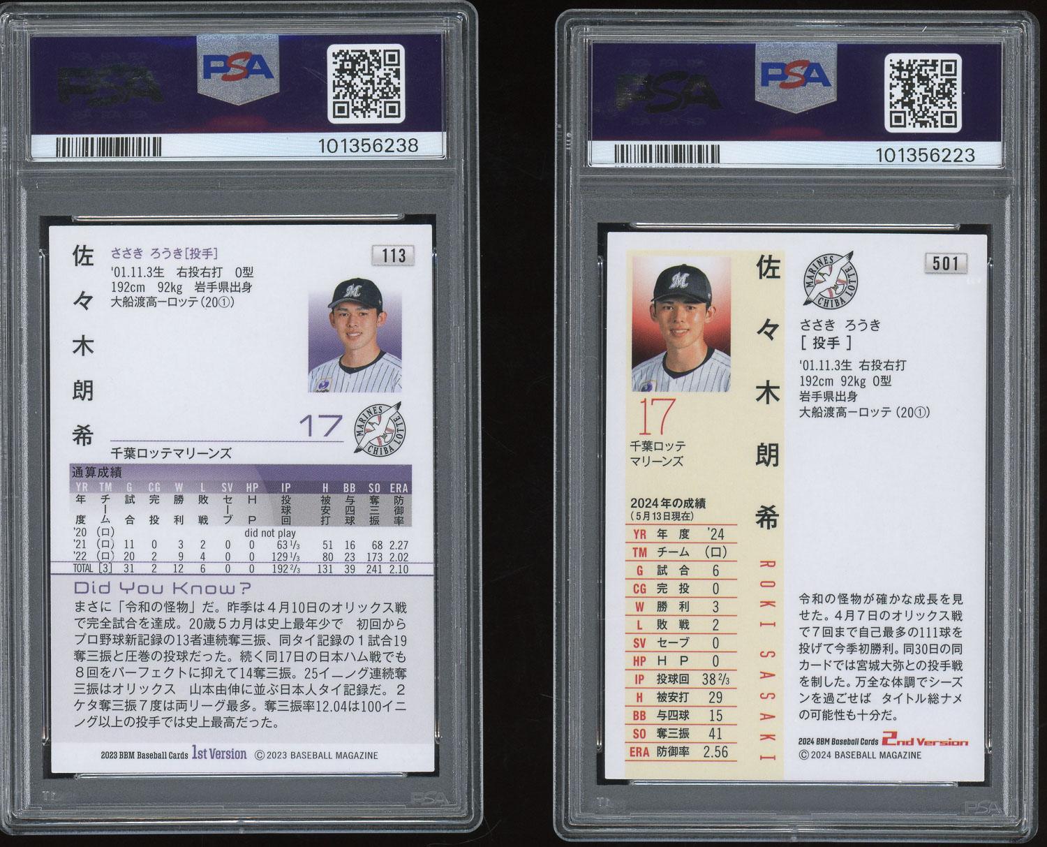 Lot of (2) Roki Sasaki BBM 1st & 2nd Version Kira Cards Both PSA Gem Mint 10!