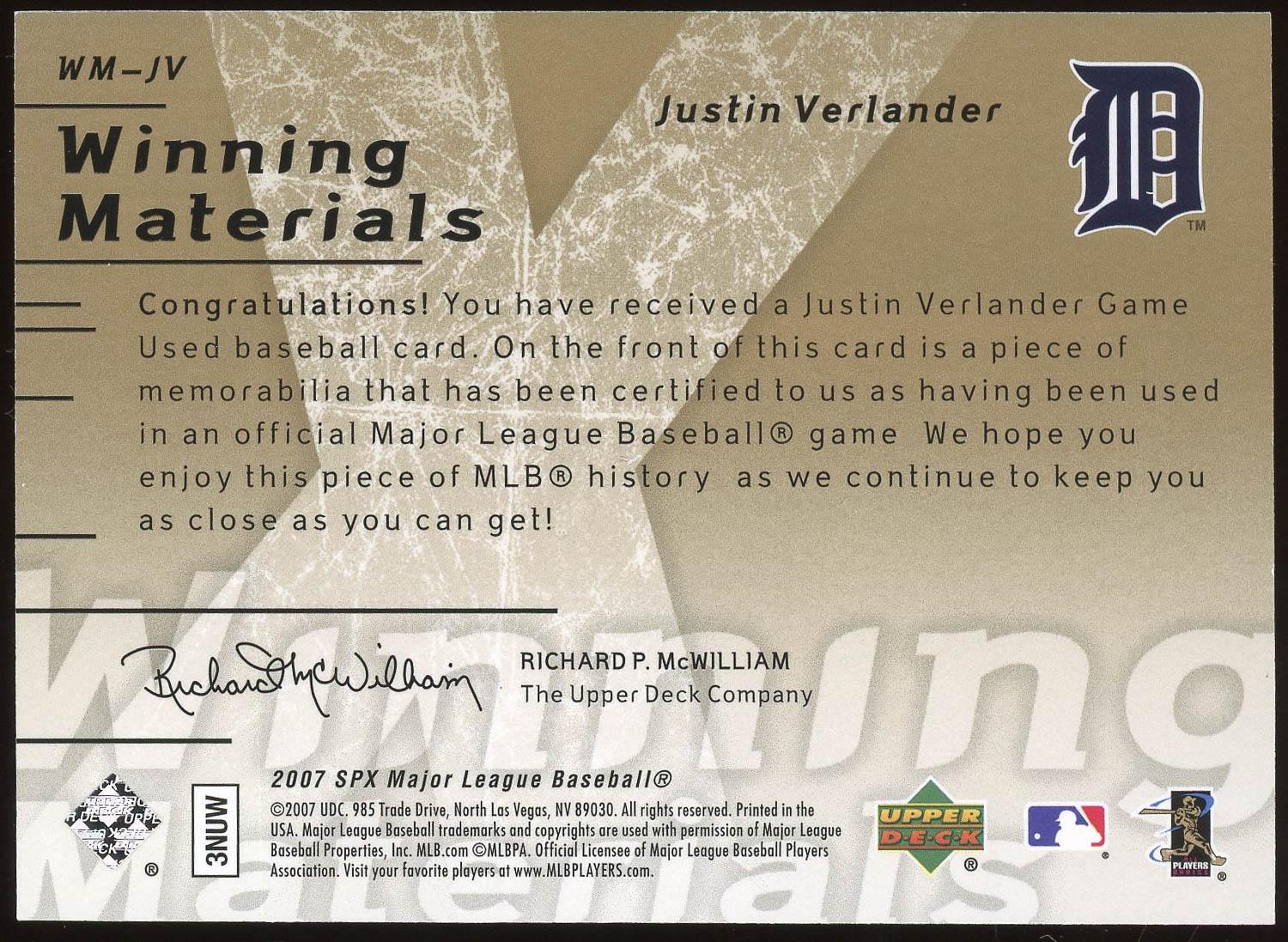 Justin Verlander 2007 SPx Winning Materials Game Used Patch Gold Card /50